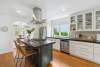 The spacious chefs kitchen with high-end appliances, including Wolf range, features an island for casual dining and a wet bar/prep area.