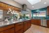 Inside, the home exudes sophistication with beautifully refinished hardwood floors throughout, complemented by new interior doors and updated light fixtures. Skylights flood the open floor plan with natural light, highlighting the seamless connection between the kitchen, dining, and living rooms, all of which provide expansive views of the water. A dual-sided fireplace adds a cozy ambiance to both the living room and dining area.