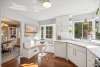 The freshly remodeled eat-in kitchen is a chef's delight, featuring brand-new Calacatta quartz countertops, a contemporary herringbone backsplash, plentiful storage, and high-end appliances. The inviting breakfast nook exudes charm and functionality, and the corner window-over-sink offers delightful views of the rear yard and patio, perfect for al fresco dining.