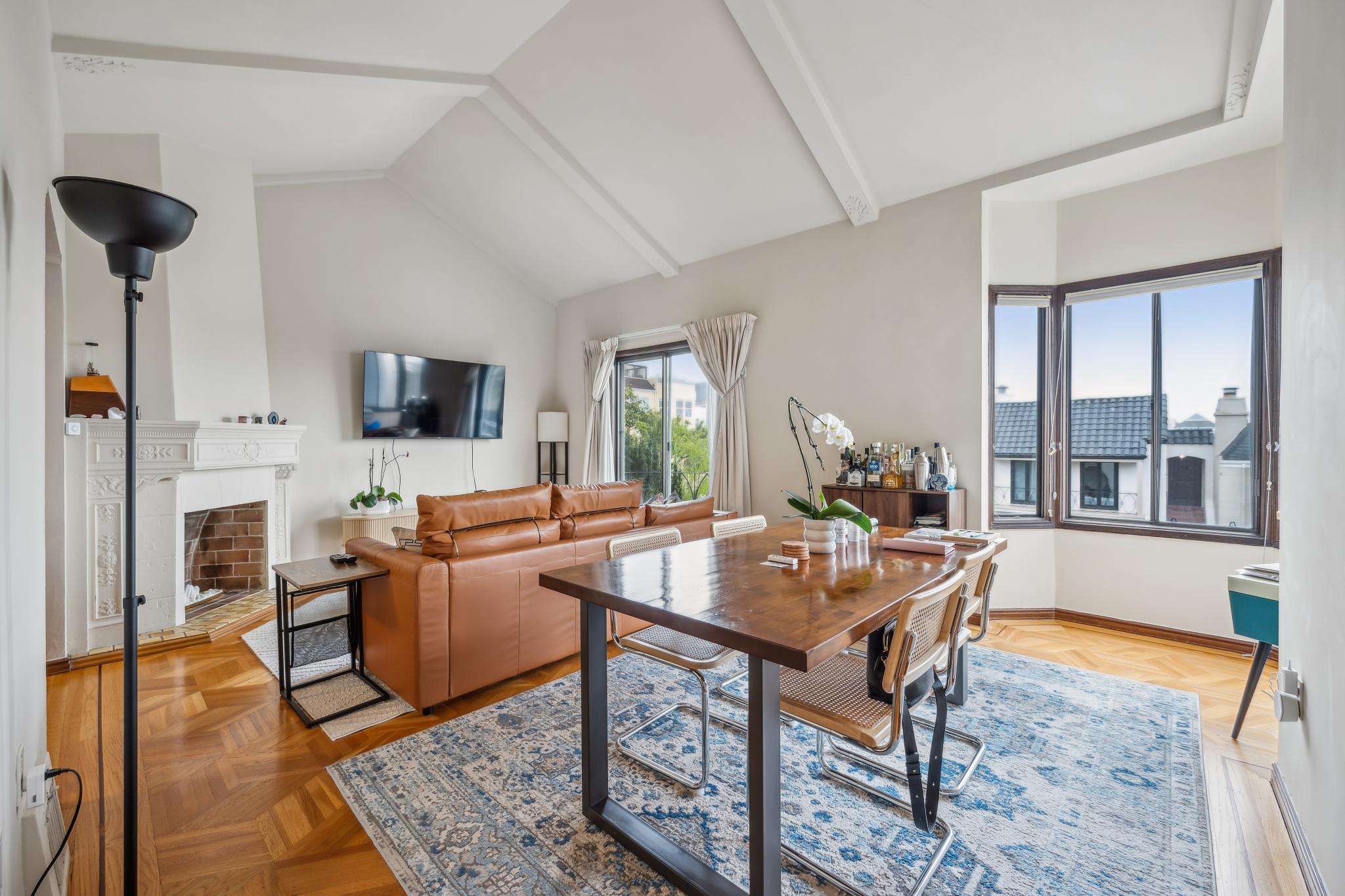 The upper level showcases two generously sized bedrooms at the rear, complemented by a full bathroom with a shower and tub. At the front, the spacious living and dining areas are adorned with vaulted beam ceilings, adding character and charm to the home’s inviting atmosphere.