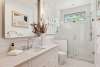 - Upstairs bathrooms both feature Carrara marble tile flooring and Carrara marble vanity tops and tub surround. Second upstairs shower features all Carrara marble.