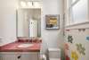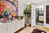 • A powder room is cleverly tucked into the hallway behind a very unique ‘cube’ which houses additional storage, a wine fridge, and TV with components