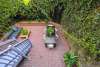 • Primary bedroom overlooking a lush landscape of neighboring yards with views spanning SF’s Downtown features space for lounging, built-in storage, and a walk-in closet