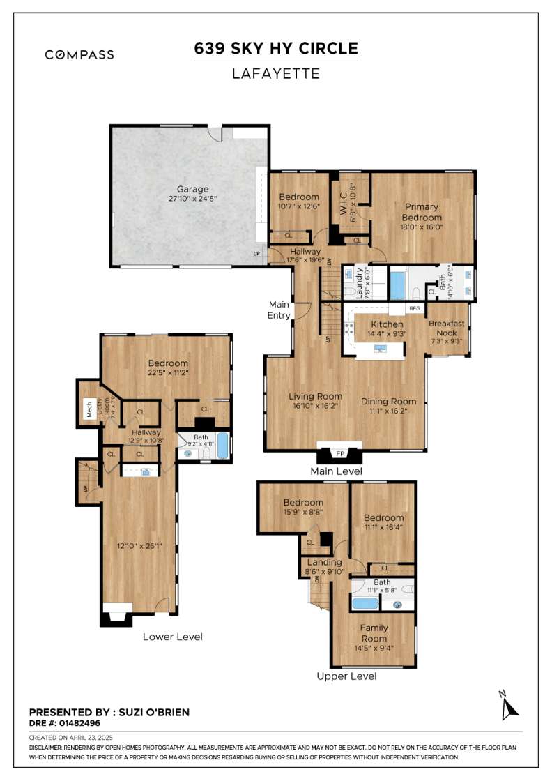 Welcome to Lafayette's desirable Sky Hy Ranch gated community. This stylish contemporary home offers a flexible floor plan filled with natural light, showcasing beautiful hardwood floors, soaring ceilings, and peaceful views. The main level features a spacious living room and dining room, an updated kitchen with stainless steel appliances, and a cozy breakfast nook. Step out onto the deck, surrounded by majestic redwoods, for a tranquil start to your day. The primary suite is a peaceful retreat with a recently updated bath, walk-in closet, and breathtaking views of the Lafayette hills. Down the hall is another bedroom with a sliding door to a deck and access to the beautifully landscaped backyard. The upper level includes two additional bedrooms, a full bath, and a playful loft area that overlooks the main living spaces. The downstairs flexible space with separate entrance is a perfect kids' hangout or an inviting in-law suite featuring a living area with built-in bar area and fireplace, a full bath, and a sunlit bedroom with views and easy access to the rear gardens. Enjoy the terraced outdoor space with decks for dining and relaxing, a grassy area for play, and a sandy play zone, all set against expansive panoramic views.