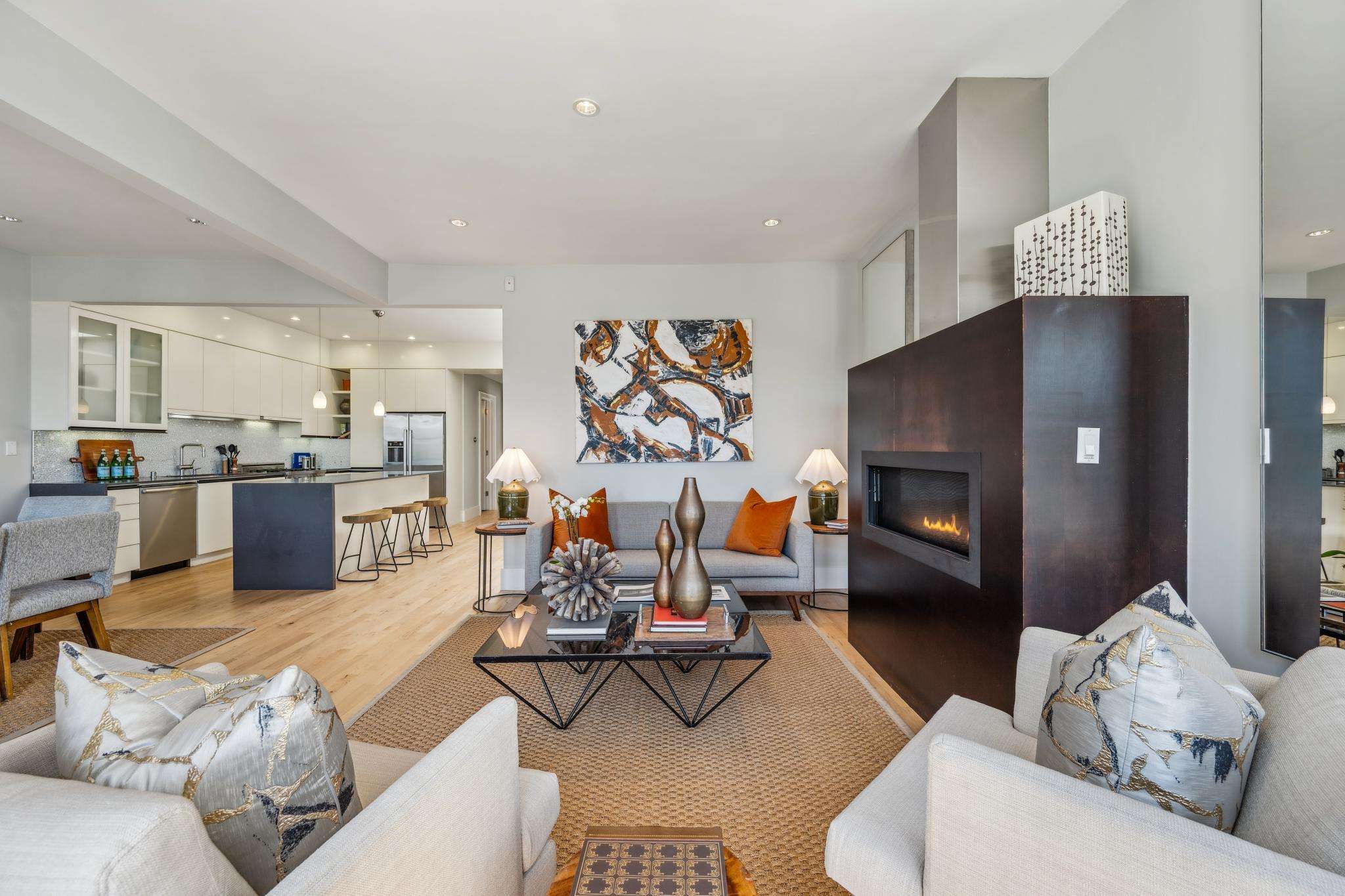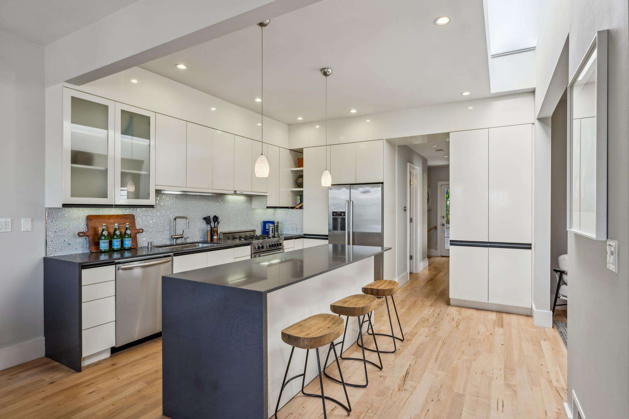 An open living/dining/kitchen area greets you upon entering the home - a spacious great room perfect for modern living, filled with light from expansive eastern-facing windows and a large skylight. A bold gas-burning fireplace anchors the living room. The dining room, immediately adjacent to the kitchen for optimal flow when entertaining, accommodates an especially long table, complemented by a dramatic custom light fixture.