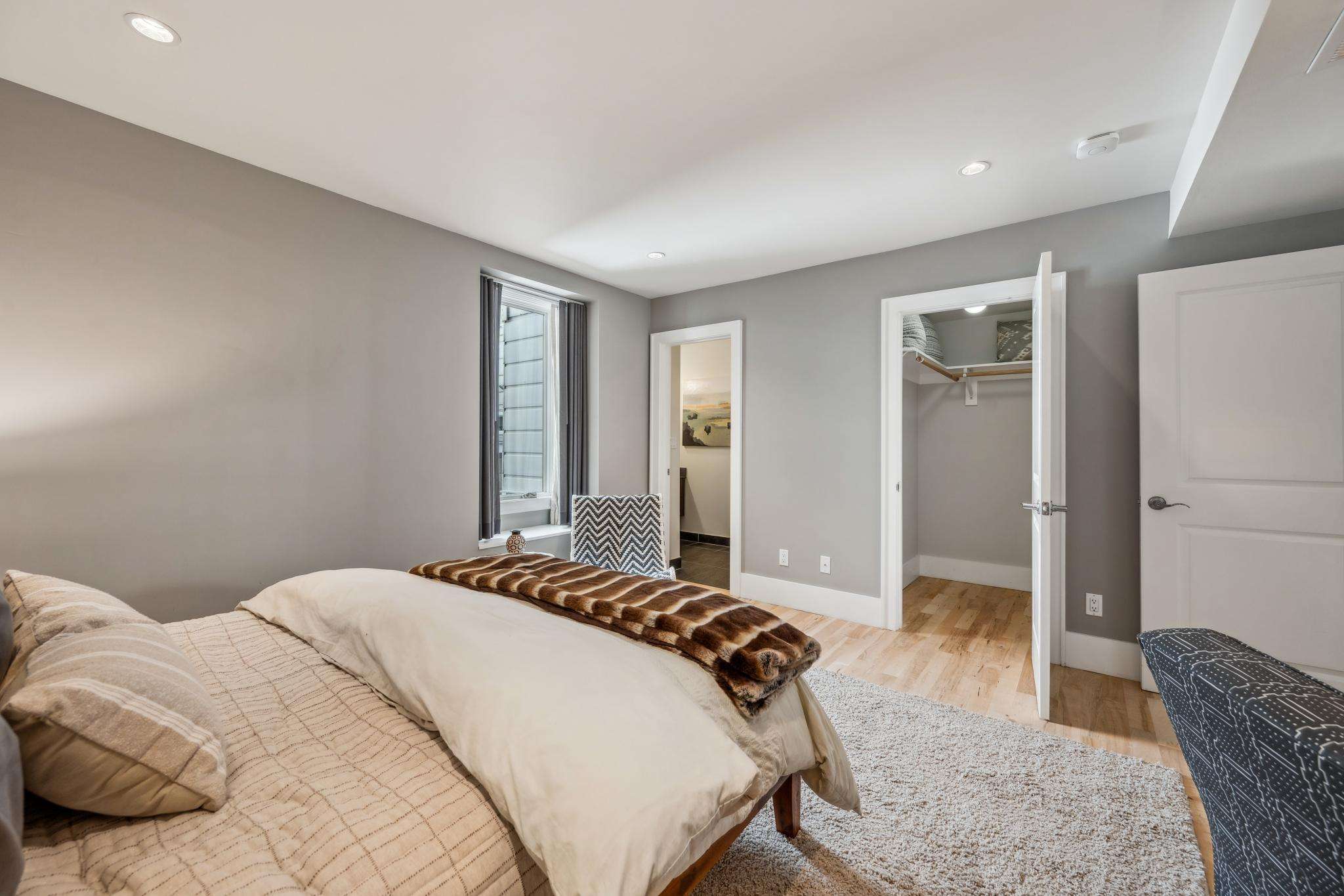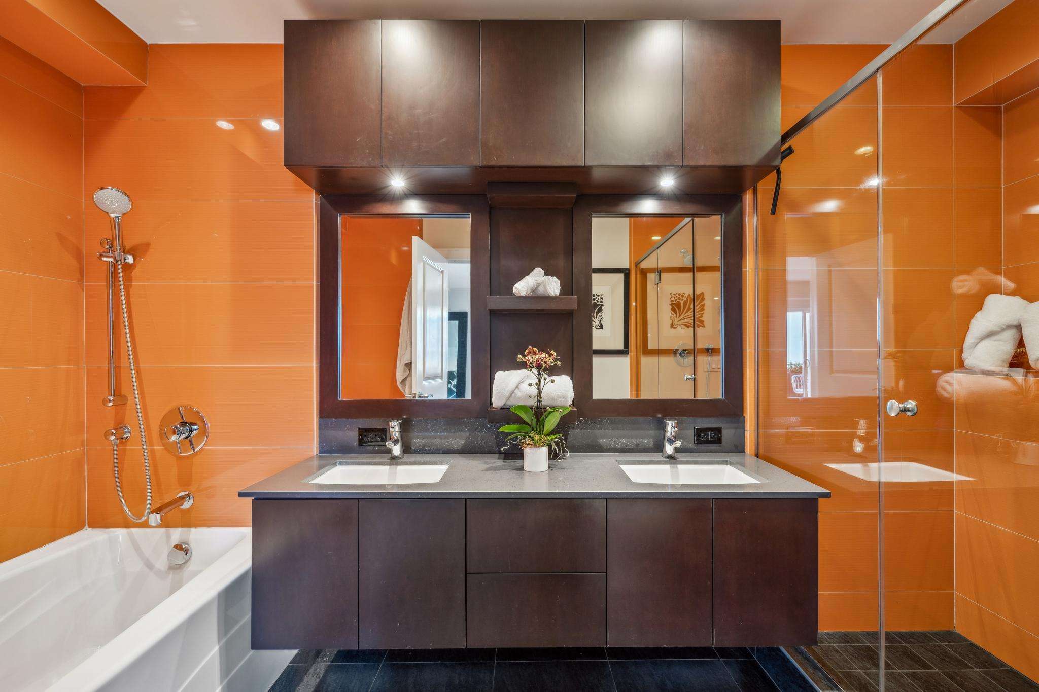 Downstairs are two additional spacious bedrooms each with their own ensuite bathrooms. The front bedroom has its own walk-out patio with built-in heat lamp. The ensuite bathroom that serves this front bedroom features a bold aesthetic with bright tilework, a jetted tub and a separate large shower stall and double sinks for the ultimate in comfort. This room also has a spacious walk-in closet. The rear bedroom on the level also has its own large walk-in closet and a full ensuite bathroom with shower over tub. On this level you will find a convenient laundry closet.