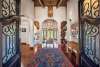 The current owners spared no expense, with no detail overlooked inside or out. Approaching the home from this prestigious cul-de-sac, the architecture stands prominent, sheltered beyond gates, impeccable hardscape, and colorful gardens. Note the organic feel of the facade with its color-infused smooth stucco, iconic arches, and wooden carriage doors. Stepping inside, soaring ceilings up to 15 feetare a signature motif that continue down a dramatic hallway. Made-to-order iron chandeliers by Steven Handelman of Santa Barbara add to the lyrical warmth, while morning sun from the east floods the ambiance with brilliant light. The sunken living room captures all the home's strengths in one stunning space: infused light, artisan woodwork, green vistas, Roman-esque archways, and European tilework. It's an Architectural Digest moment, and there's more rooms to come!