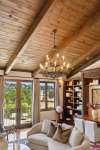 The through-composed nature of this renovation means the flow from space to space is seamless. The dining room (9 ft. ceilings) takes advantage of a front courtyard patio for extended entertaining. In the kitchen, 10 ft. ceilings with a spectacular skylight grid rise above a 10 ft. center island. Appliances by Wolf, Sub-Zero and Miele appoint custom cabinetry. The island countertop is another work of art, composed of exotic Lemurian Blue granite with its abalone and cerulean tones. A built-in banquette flanks an access to a handy side barbecue patio. Adjacent to the kitchen, the family media room (vaulted ceiling peak 15+ feet) brings the outdoors in. French sliders reveal the huge expanse of resort-like grounds on this .63 acre view parcel.