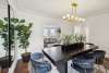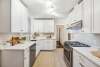 A tastefully remodeled kitchen features ample cabinetry, quartz countertops, a sleek stainless-steel Bosch gas range, dishwasher, and Fisher & Paykel refrigerator.
