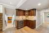 - Wet bar with wine refrigerator, upper & lower cabinets, sink, granite counters & tile backsplash