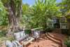 Enchanting rear veranda of the home encapsulates the ambiance and tranquility of Southern comfort. It sets a tone as the ideal place to welcome the overwhelming natural beauty that totally erupts with radiant color, meandering paths, and a trail of wooden steps to the mesmerizing terraced creek below. Utterly spellbinding.