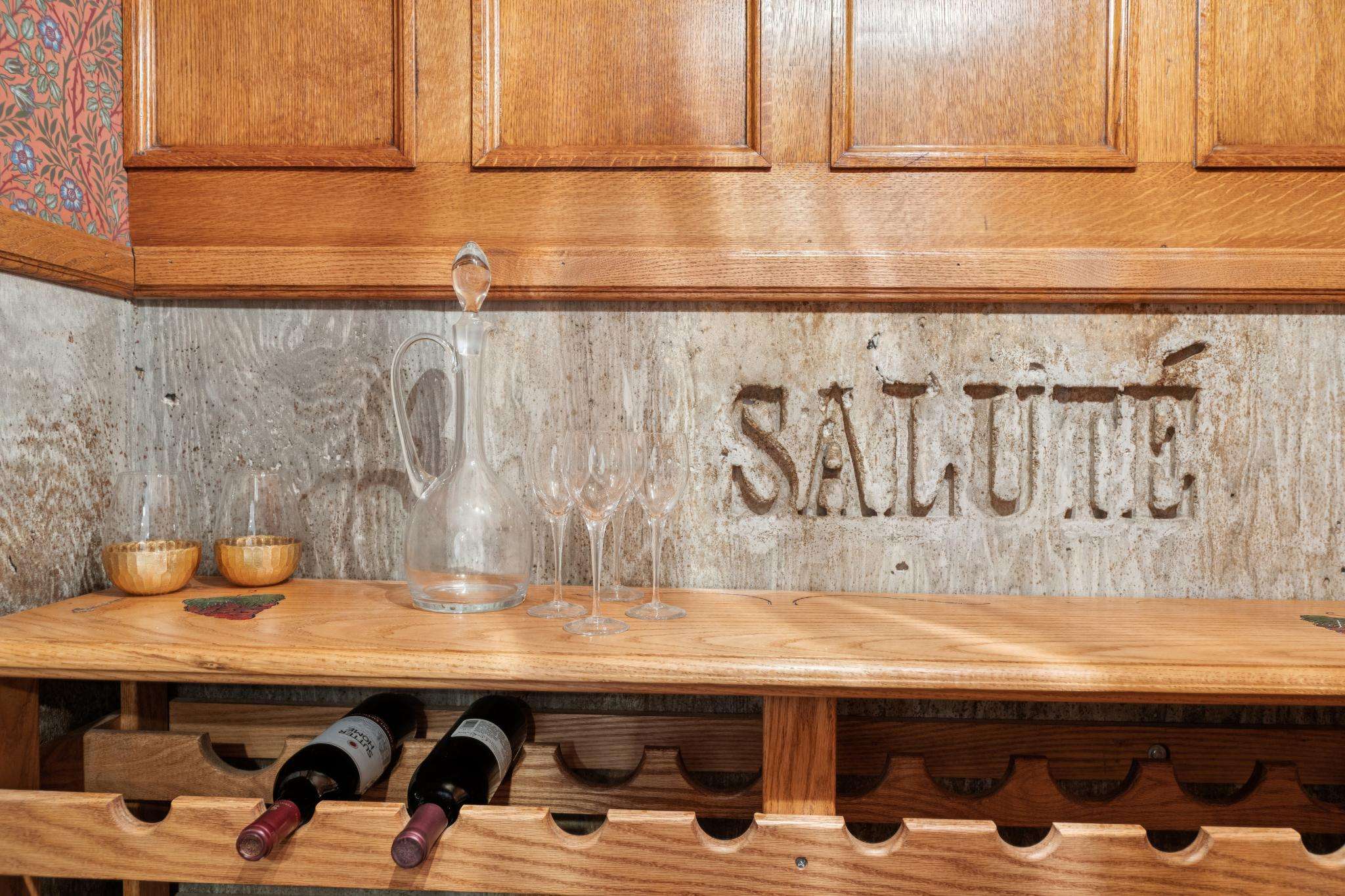 Downstairs, you’ll discover the original third bedroom, with parquet hardwood floors and a French pocket door, used as the family room, currently staged as a wine-tasting room… because there’s also a Wine Cellar! Custom-built with oak panels, wine racks, William Morris-style wallpaper, a vintage door, and even a hidden safe. It’s like a step through time and just so cool!