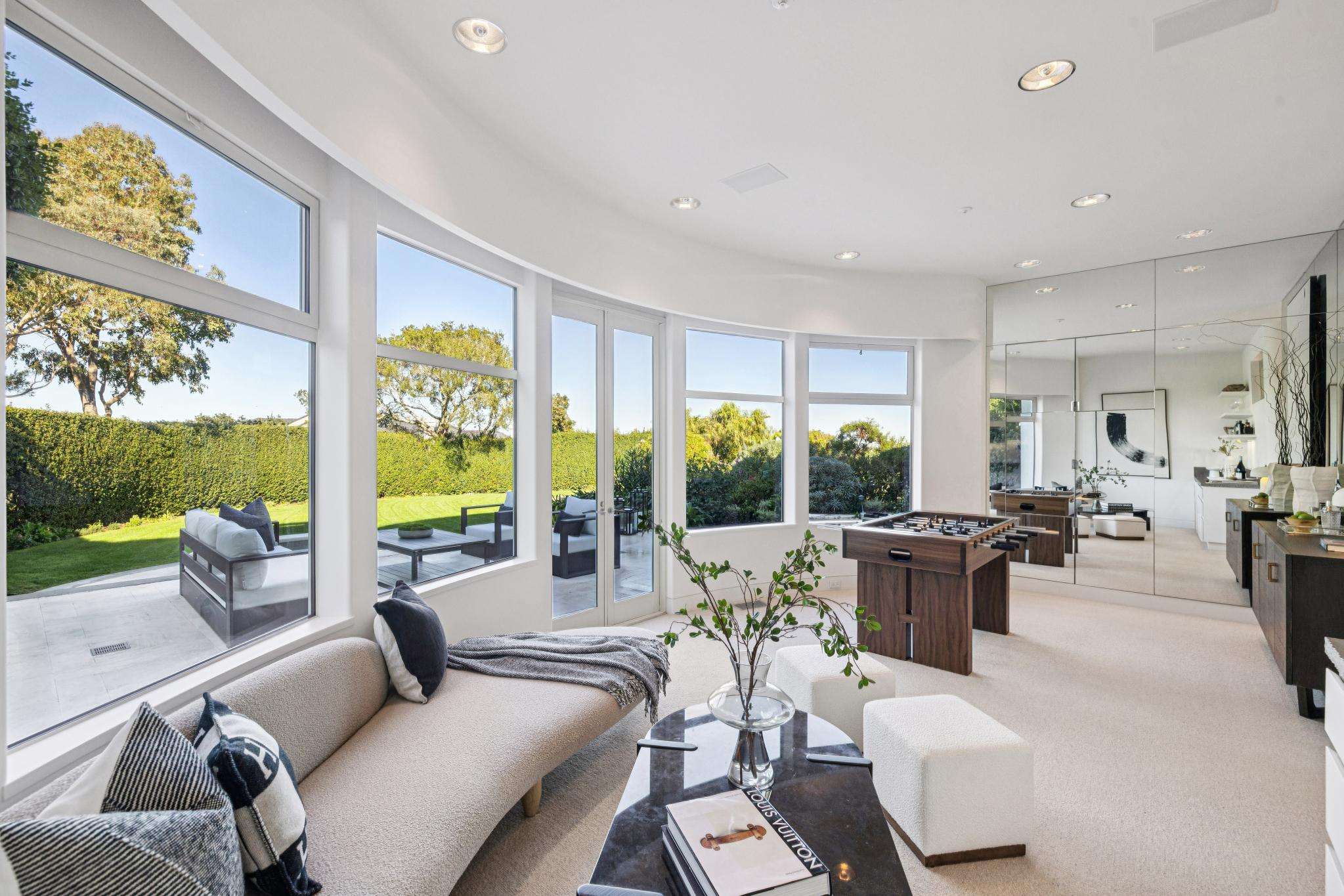 Inside, more than 5,575 square feet of light-filled, an ultra-polished living space unfolds. A dramatic double-height entry with curved staircase crowned by a stunning 16-ft. skylight sets the tone as bright, bold, and architecturally unforgettable.