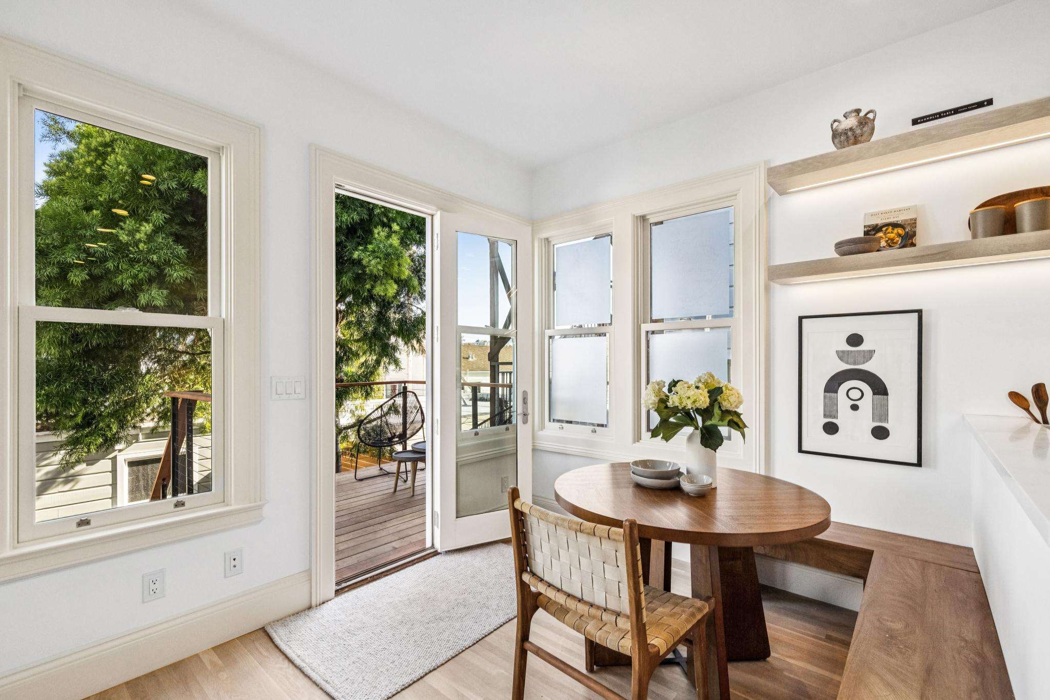 The kitchen, breakfast nook, and office area overlook the garden and are bathed in natural light, opening to a sun-drenched deck outfitted with a gas line. The chef’s kitchen features quartz countertops, custom cabinetry, and built-in appliances, including a Thermador gas range, with abundant workspace and storage. Two spacious bedrooms and a designer, fully tiled bath complete the main level.