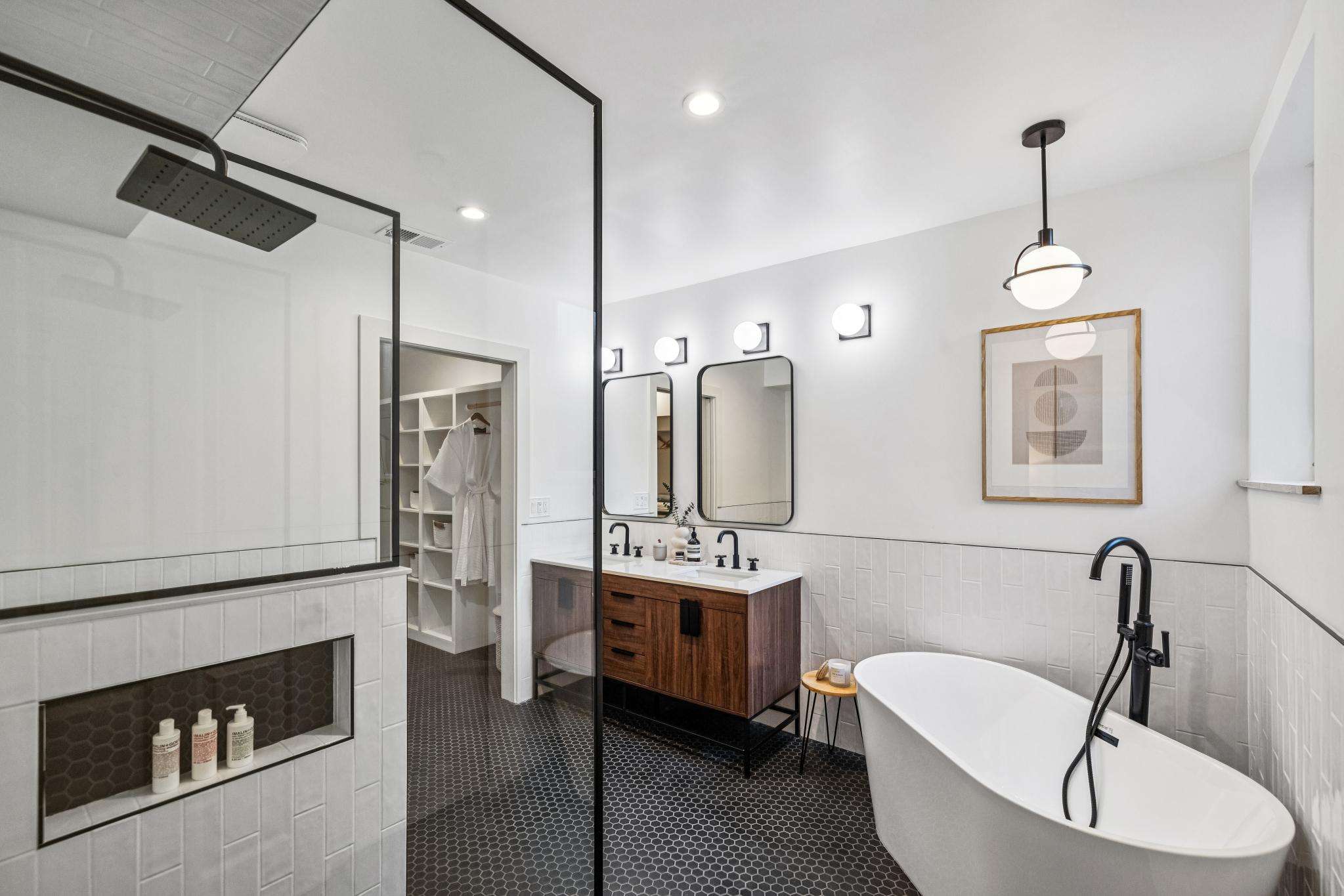 Downstairs, a generous family room opens directly to a lush, professionally landscaped garden. The sumptuous primary suite features a spa-like tiled bath with soaking tub, walk-in shower, and a walk-in closet with integrated laundry.