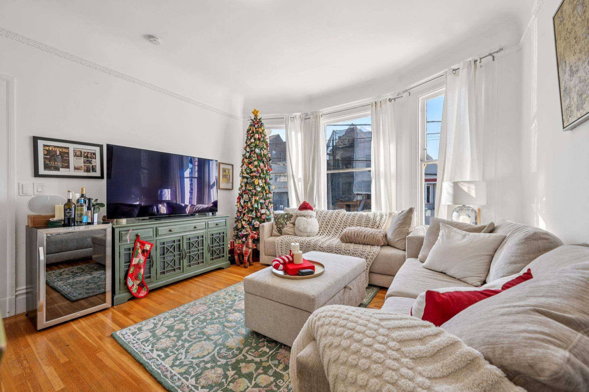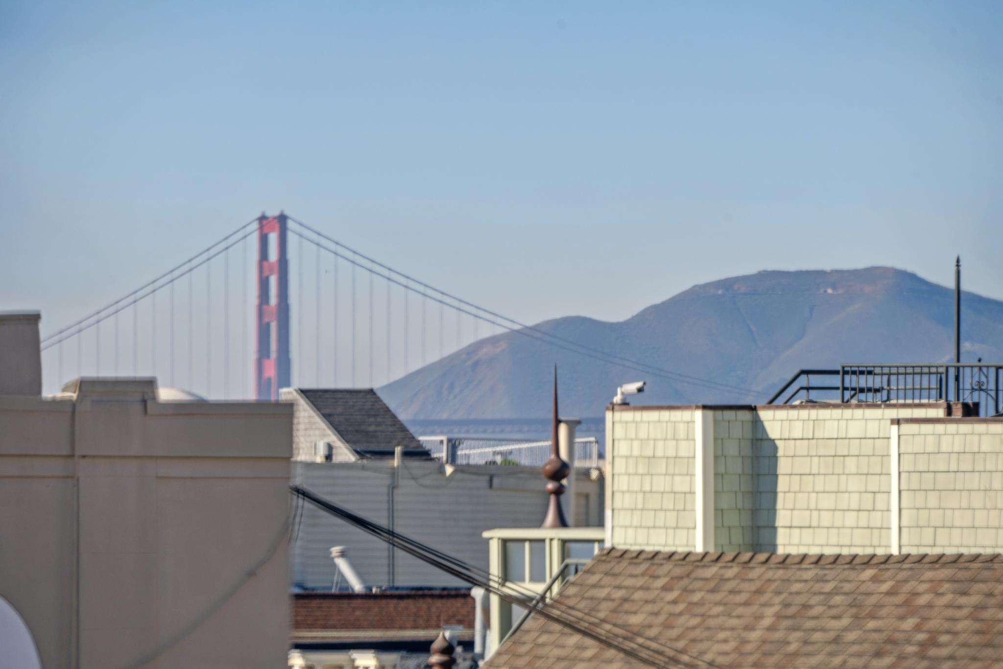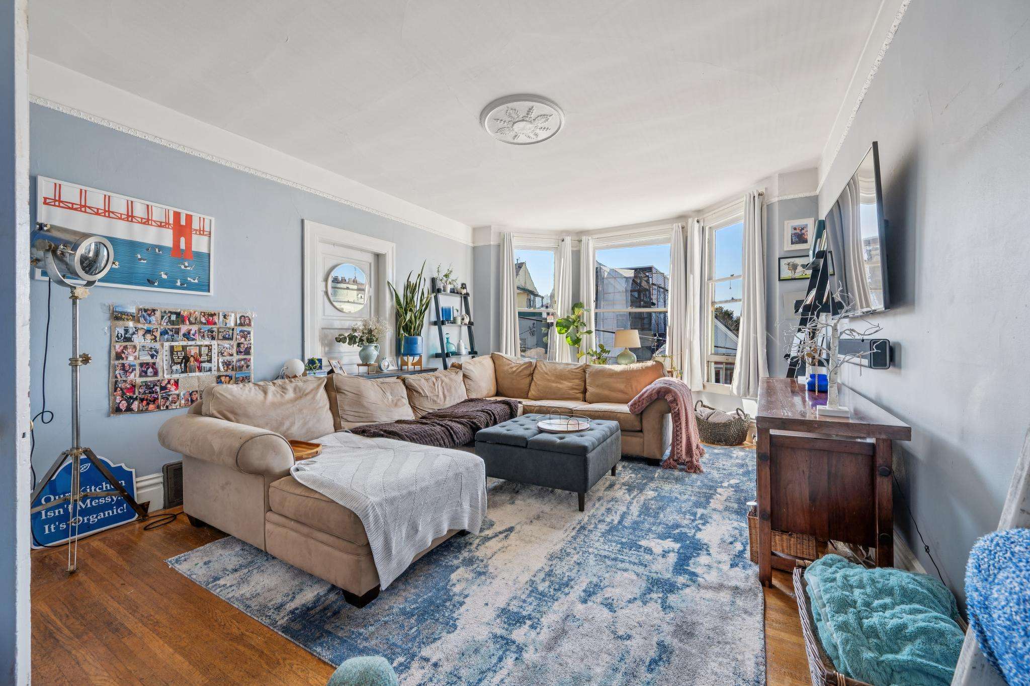 Continuing clockwise from the landing, the first bedroom features tall ceilings, hardwood floors, and bright street-facing windows offering plenty of natural light. Next is a spacious, sunny living room with hardwood floors and classic west-facing bay windows, offering a peek-a-boo view of the Golden Gate Bridge.