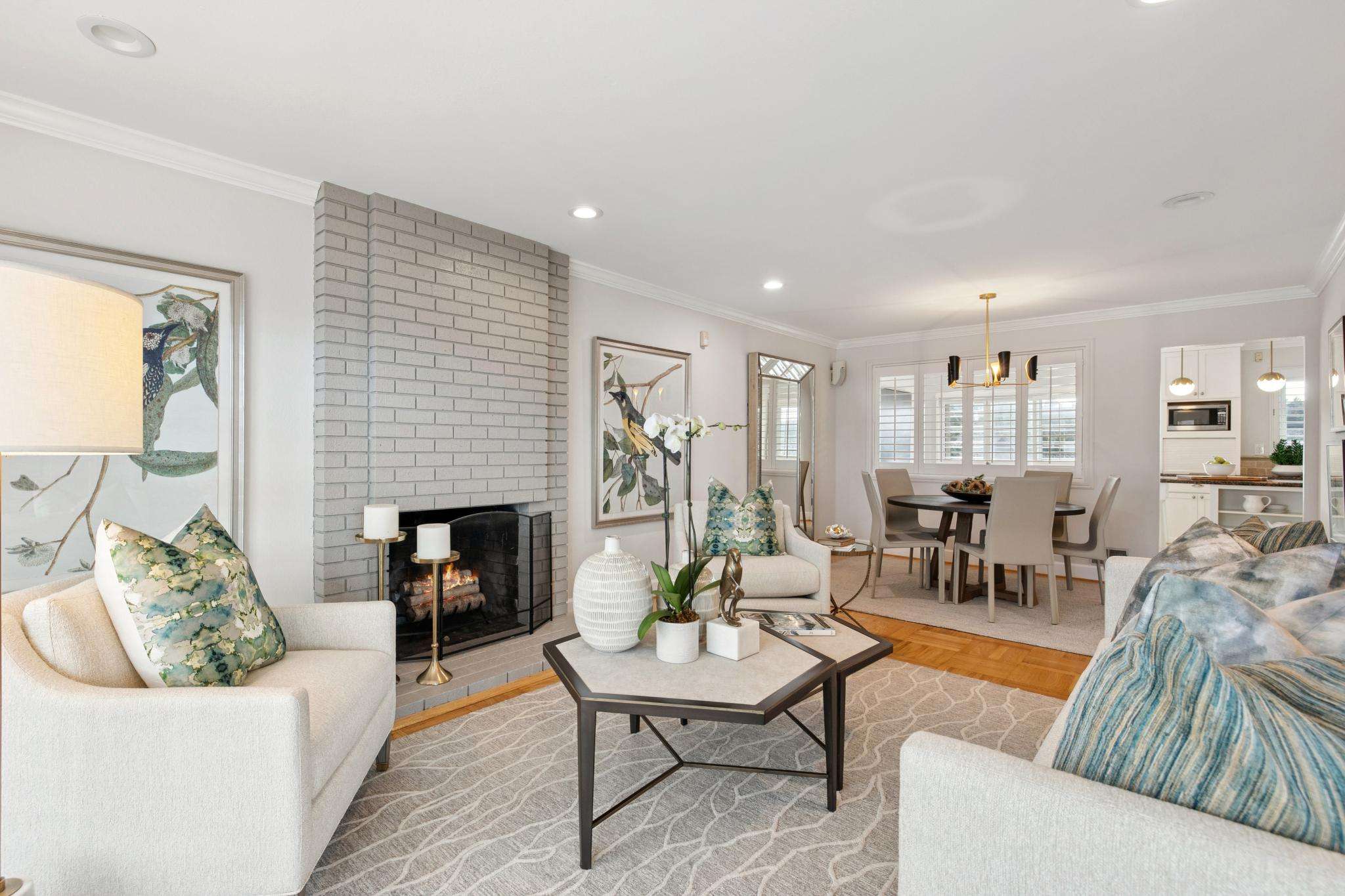 - Bright living room with floor-to-ceiling fireplace and open dining area
