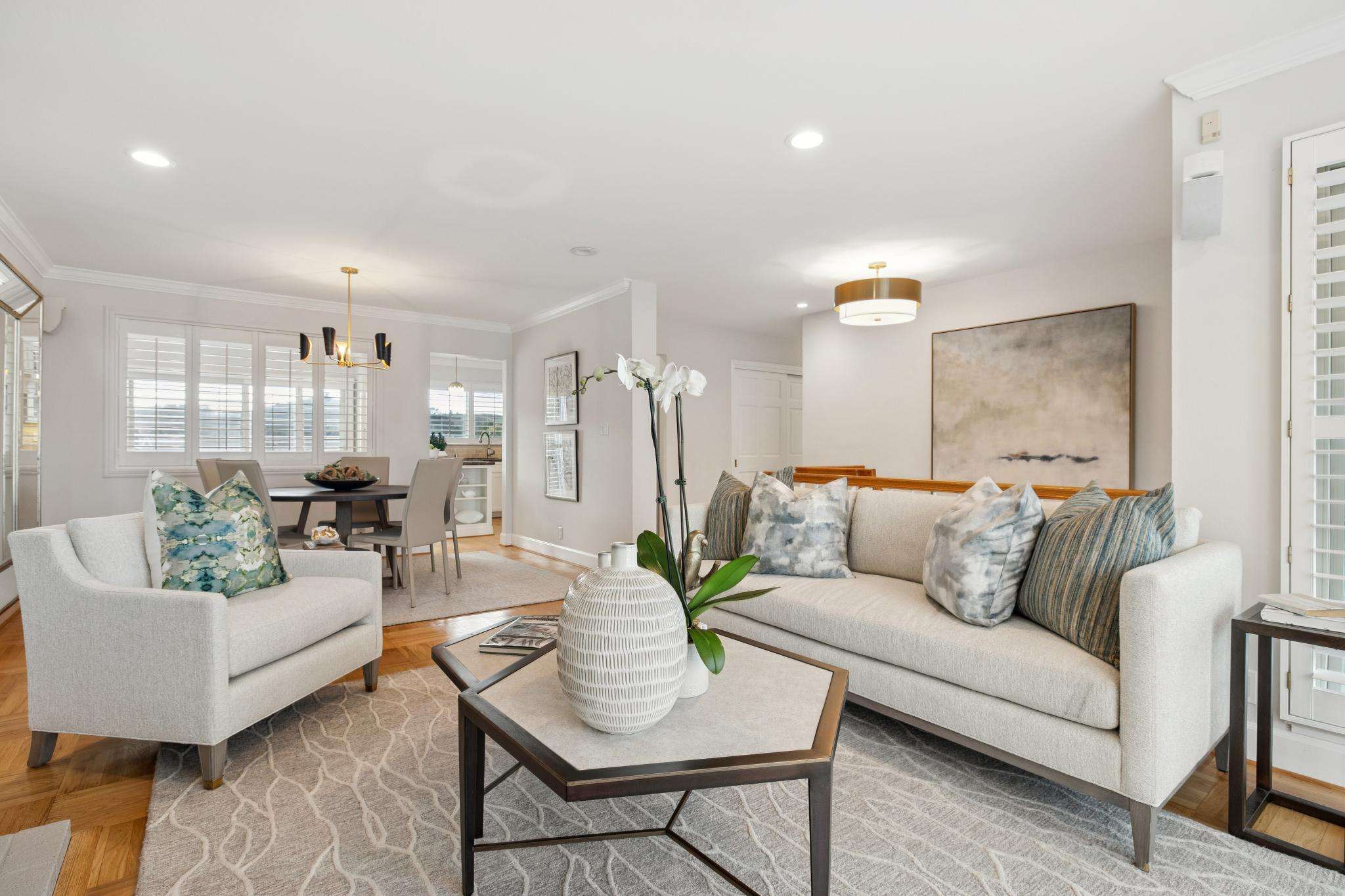- Hardwood floors, plantation shutters, crown molding, recessed lighting, modern ceiling fixtures, and lovely stone and tile surfaces throughout