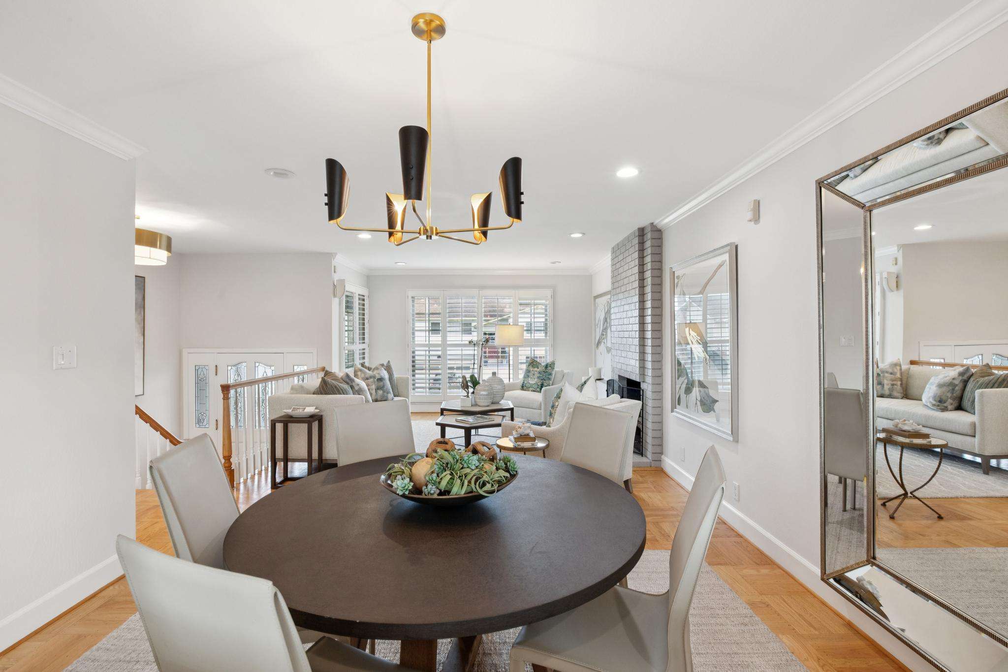 - Living room has a floor-to-ceiling fireplace, huge window finished with plantation shutters, and an open dining area with large kitchen pass-through, also finished with shutters