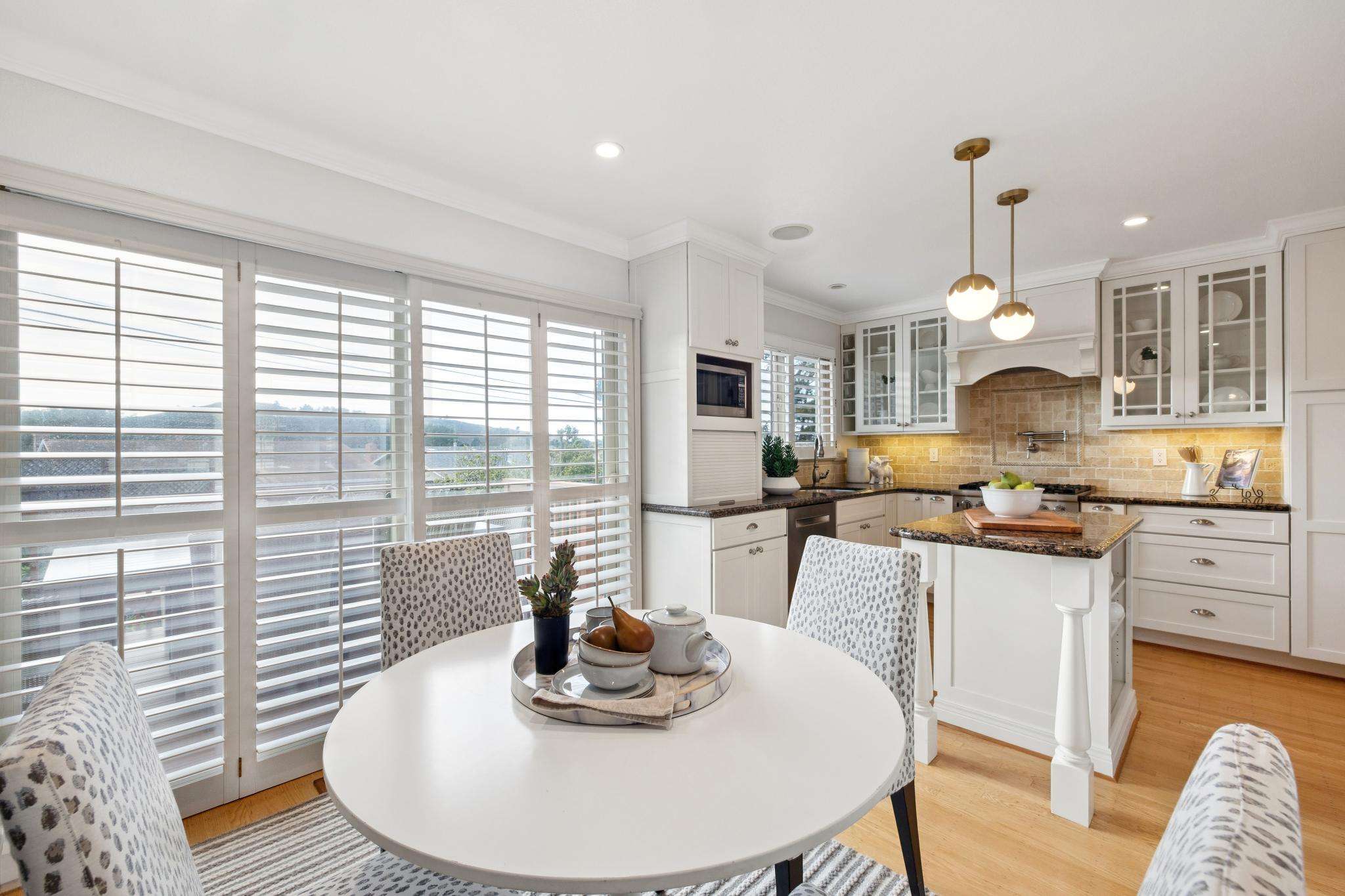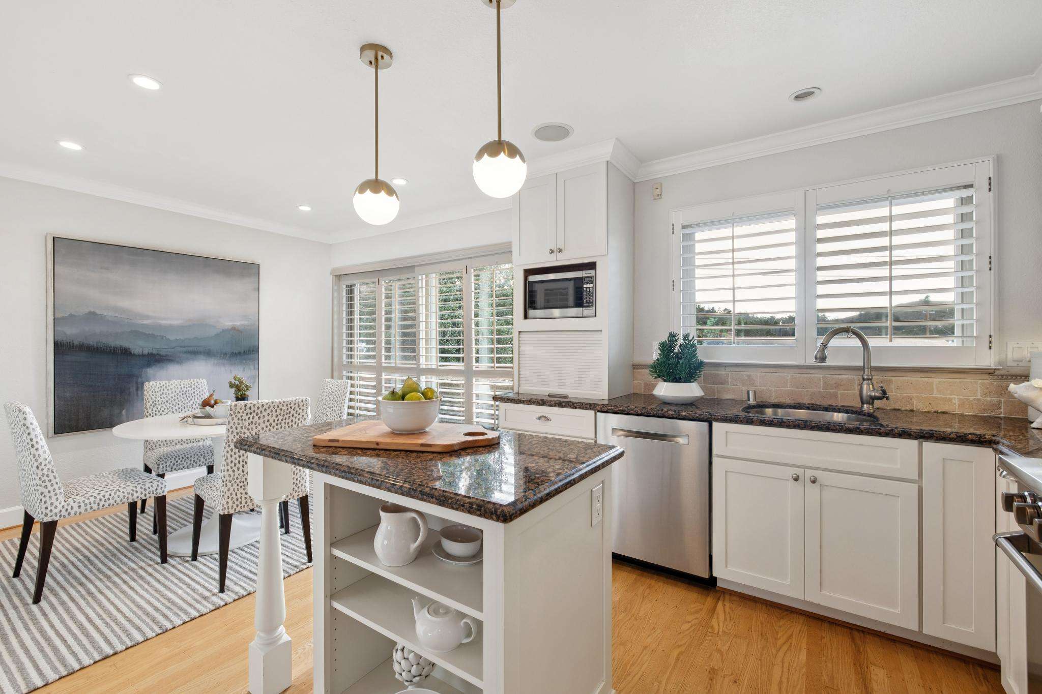 - Charming eat-in kitchen has stylish white cabinetry, a petite dining island with pendant lights, granite counters, tile backsplashes, and appliances which include a Viking stove with pot filler, stainless steel dishwasher and microwave, and a French door refrigerator; the eat-in area opens to a new, two-tiered deck via sliding glass door