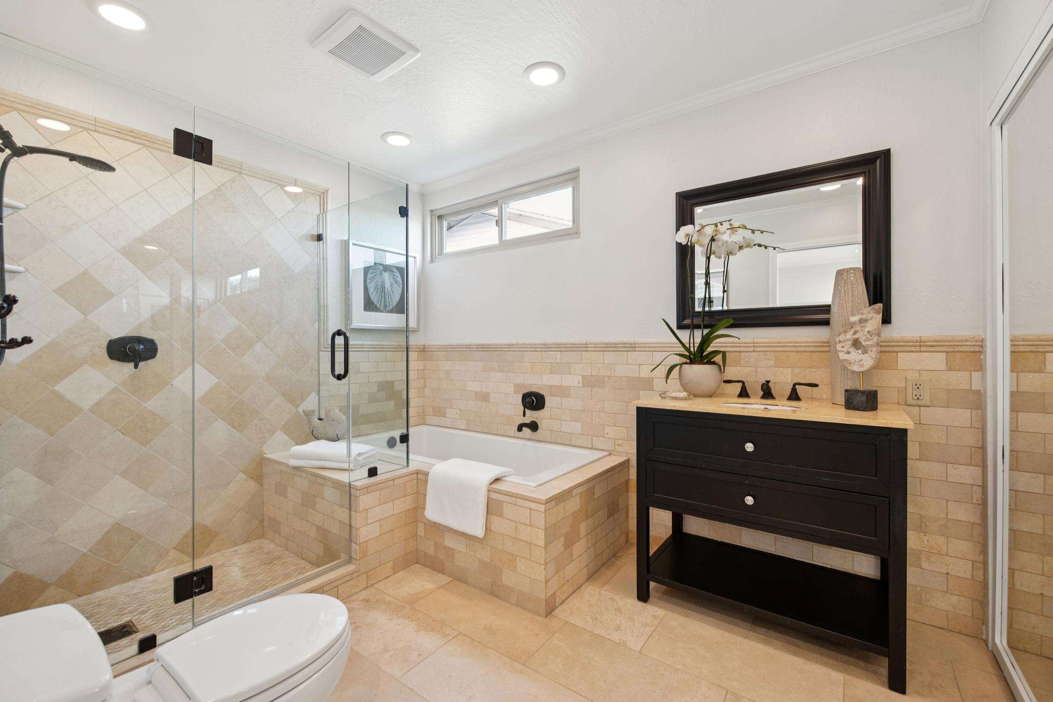 - Primary boasts a tiled bathroom with a furniture-style vanity, tub step-in frameless glass shower and tub