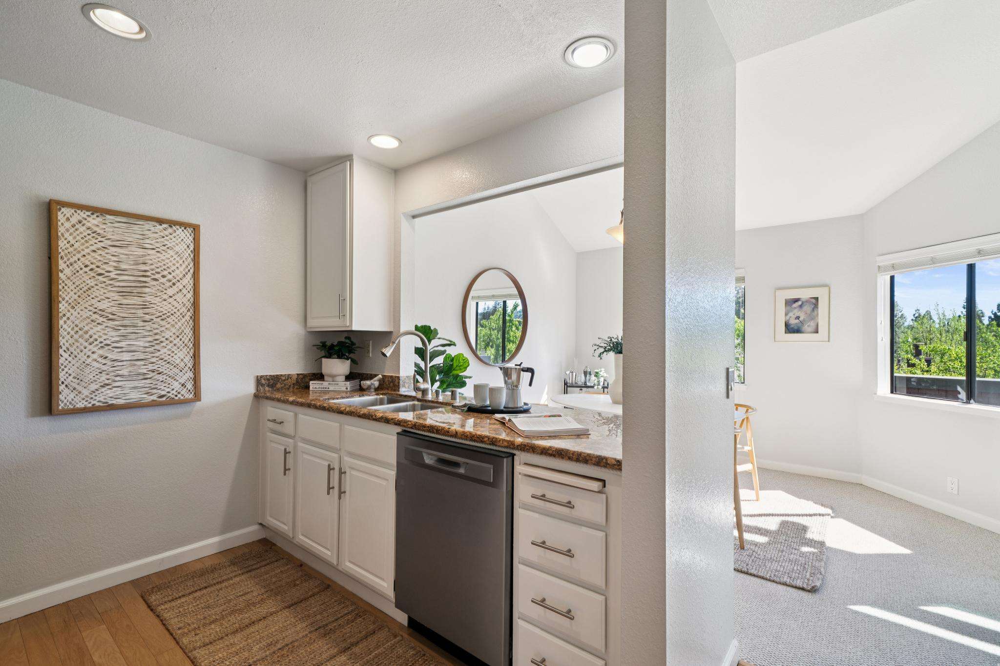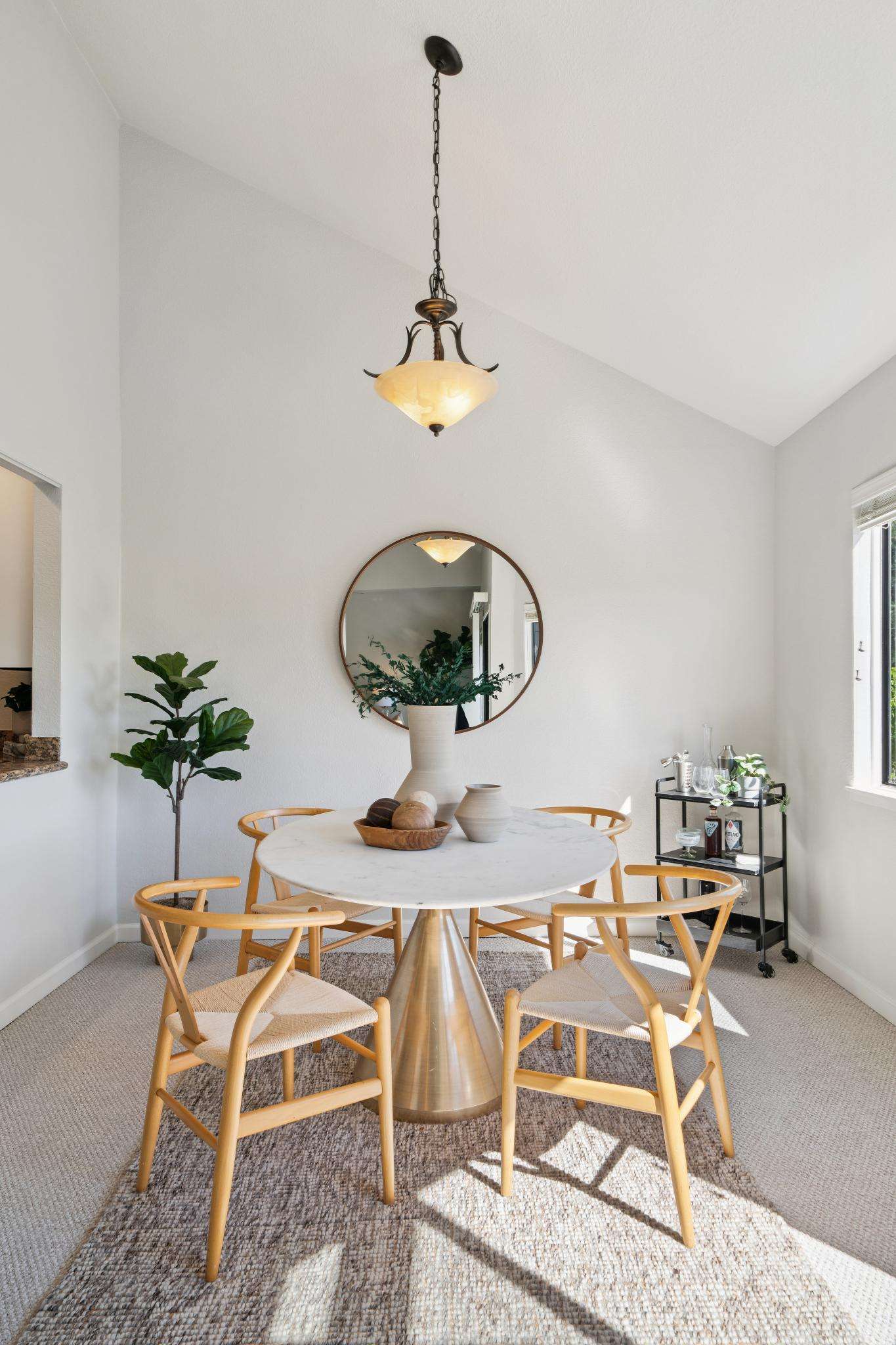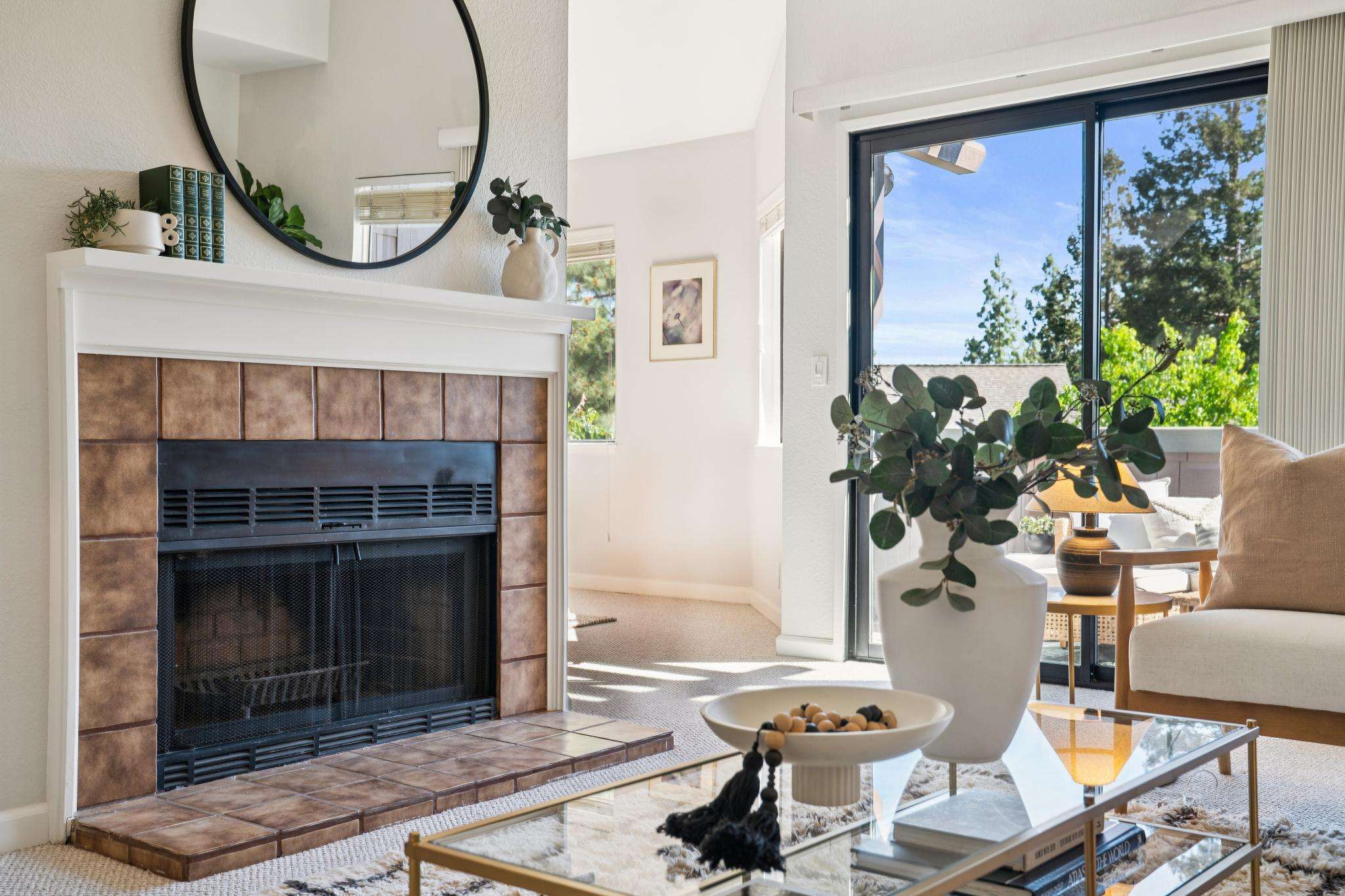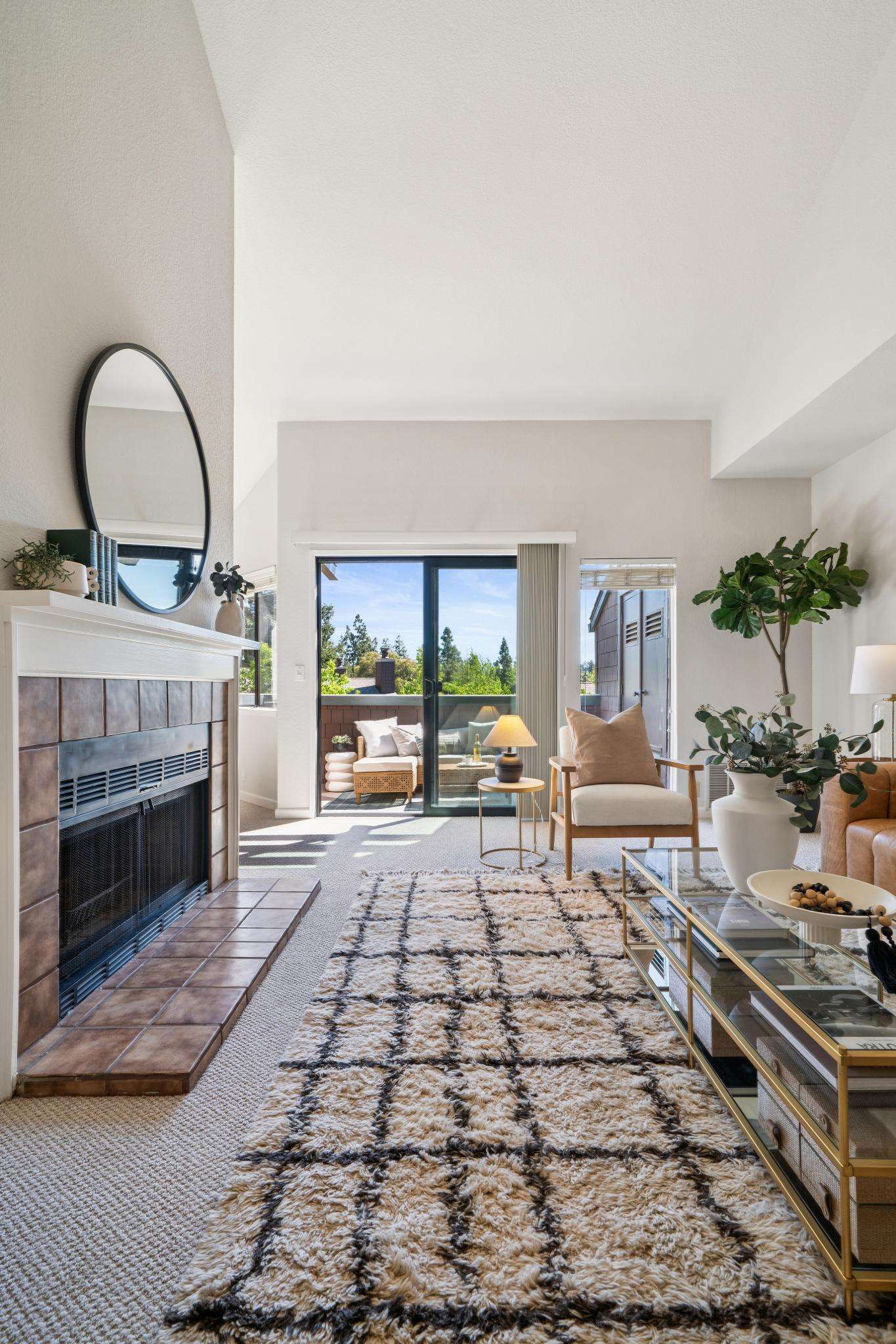 Nestled in Pleasant Hill’s serene Cobblestone community, 10 Pomfret Walk is a two-bedroom, two-bathroom condo perched in a tree-lined setting. Spacious and light-filled, the living room showcases a large fireplace with a mantel and tile hearth. Multiple windows and sliders to the balcony provide warm light and views of Mt Diablo. The open floor-plan affords ample space for gatherings, with room for a large sectional in the living room and dining set in the dining area.