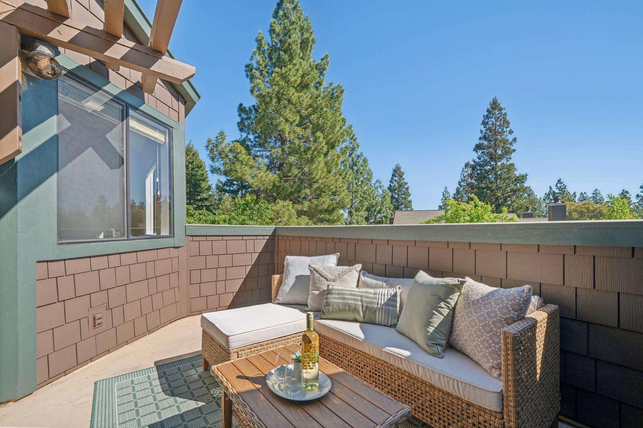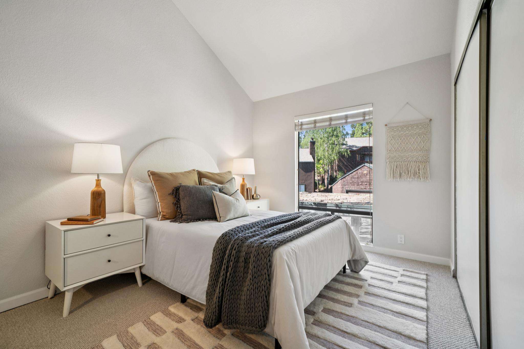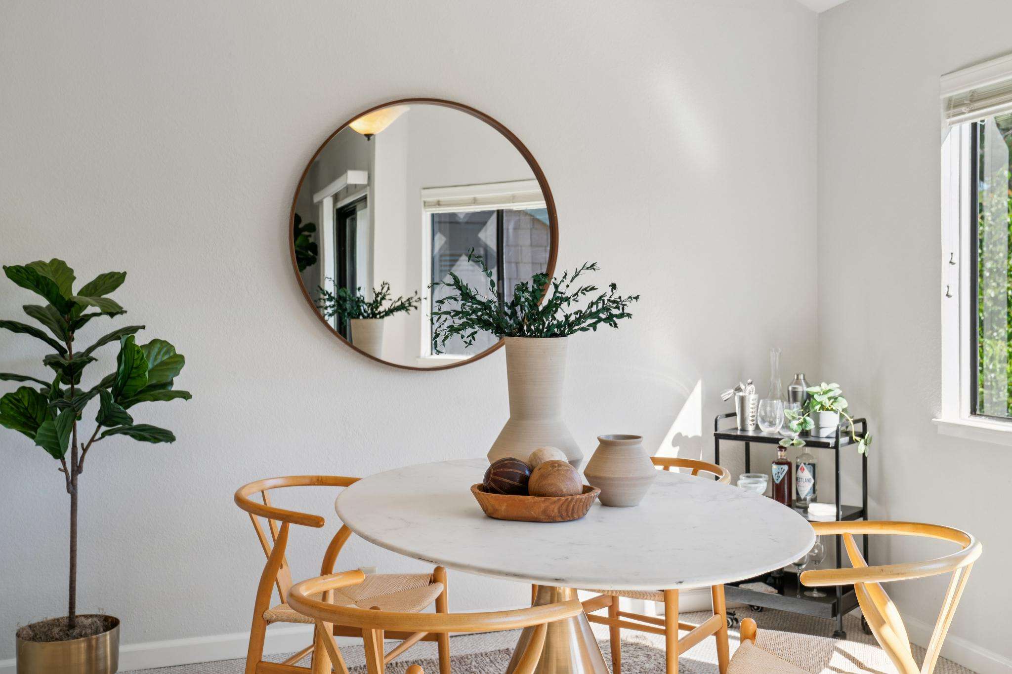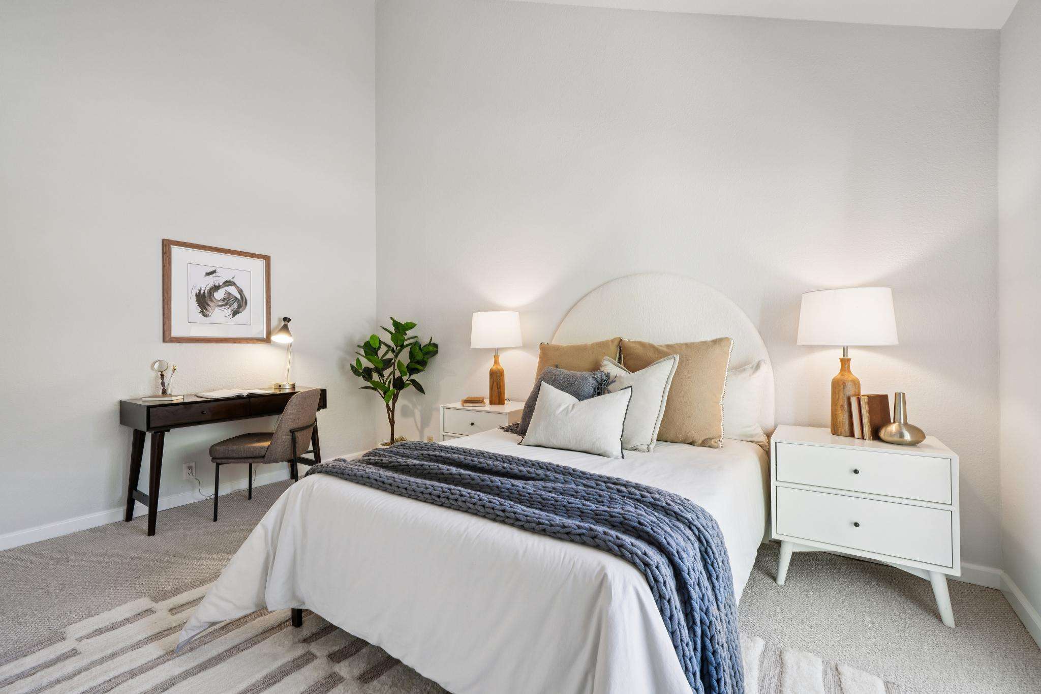 Nestled in Pleasant Hill’s serene Cobblestone community, 10 Pomfret Walk is a two-bedroom, two-bathroom condo perched in a tree-lined setting. Spacious and light-filled, the living room showcases a large fireplace with a mantel and tile hearth. Multiple windows and sliders to the balcony provide warm light and views of Mt Diablo. The open floor-plan affords ample space for gatherings, with room for a large sectional in the living room and dining set in the dining area.