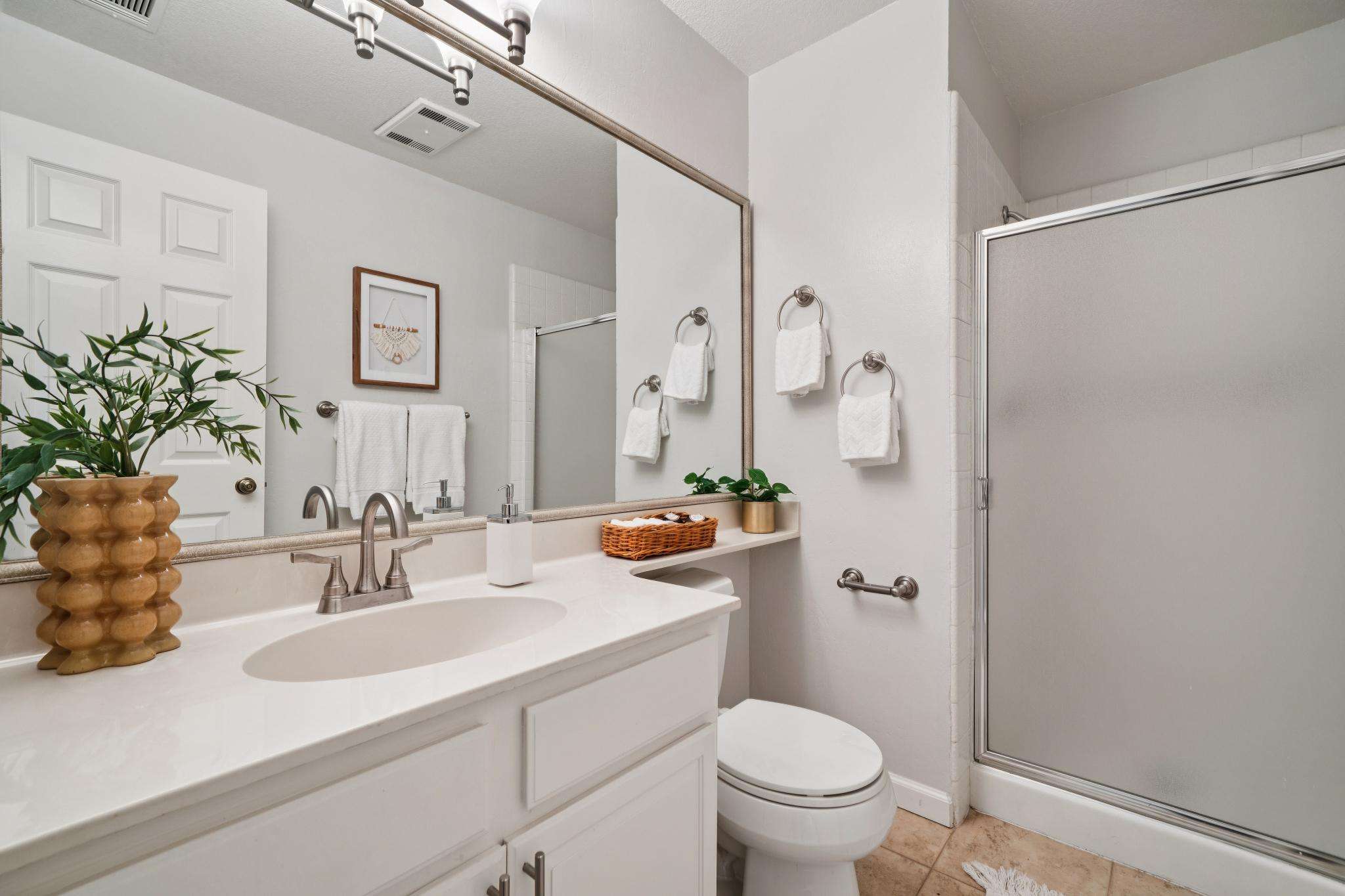 The sizable primary bedroom features loads of light and two deep closets with built-ins. The en-suite bath boasts modern lighting, an oversized mirror, and a spa-like shower with a large soaking tub. This is the perfect spot to unwind with a bubble bath at the end of a long day. The airy, light-filled second bedroom showcases a huge closet and soft carpeting. The hall bathroom shines with stunning lighting, an oversized mirror, and a lovely glass shower door.