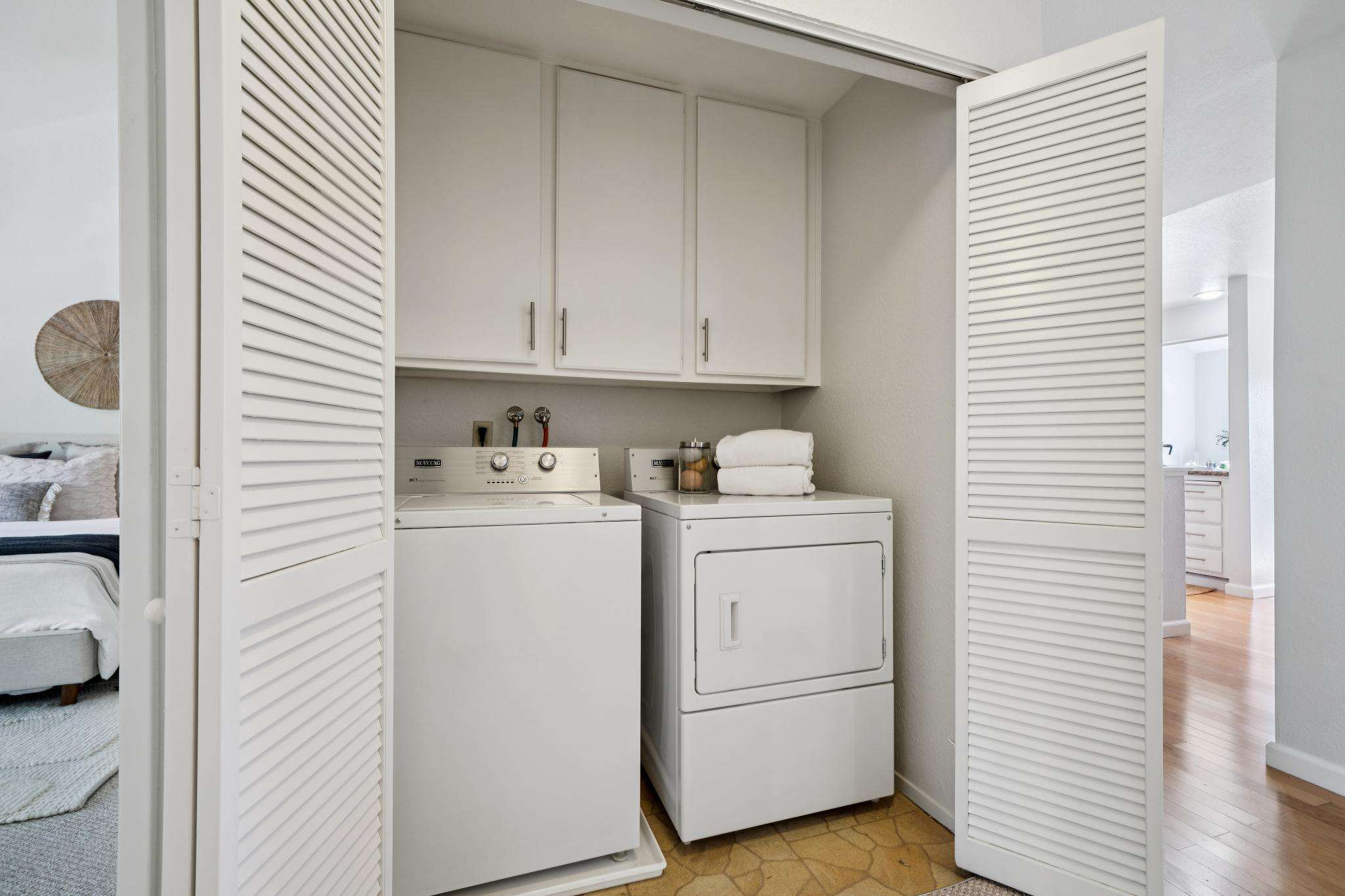 The kitchen is a home chef’s dream! It gleams with granite countertops, open breakfast bar, and new stainless steel appliances. There is a deep double sink, plenty of counter space, and considerable storage in the numerous cabinets. Laundry will be a breeze with the washer and dryer units cleverly tucked into a hall closet. There are also cabinets to store all your laundry essentials. Additional storage can be found in the hall and linen closets.