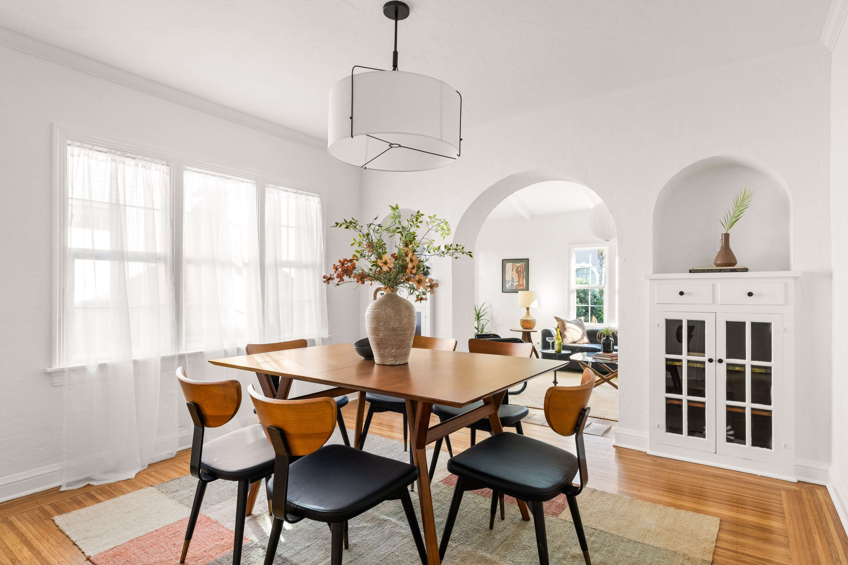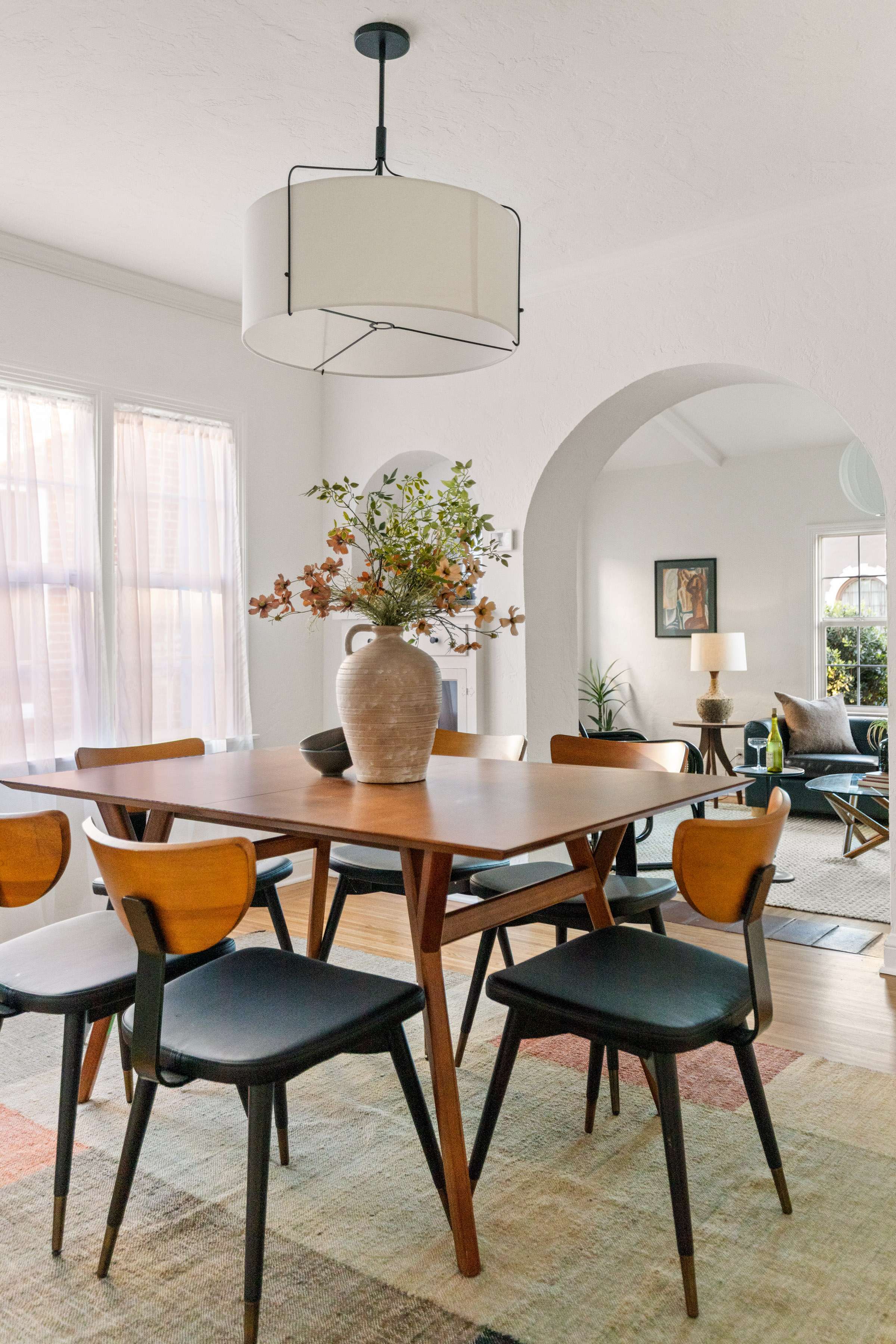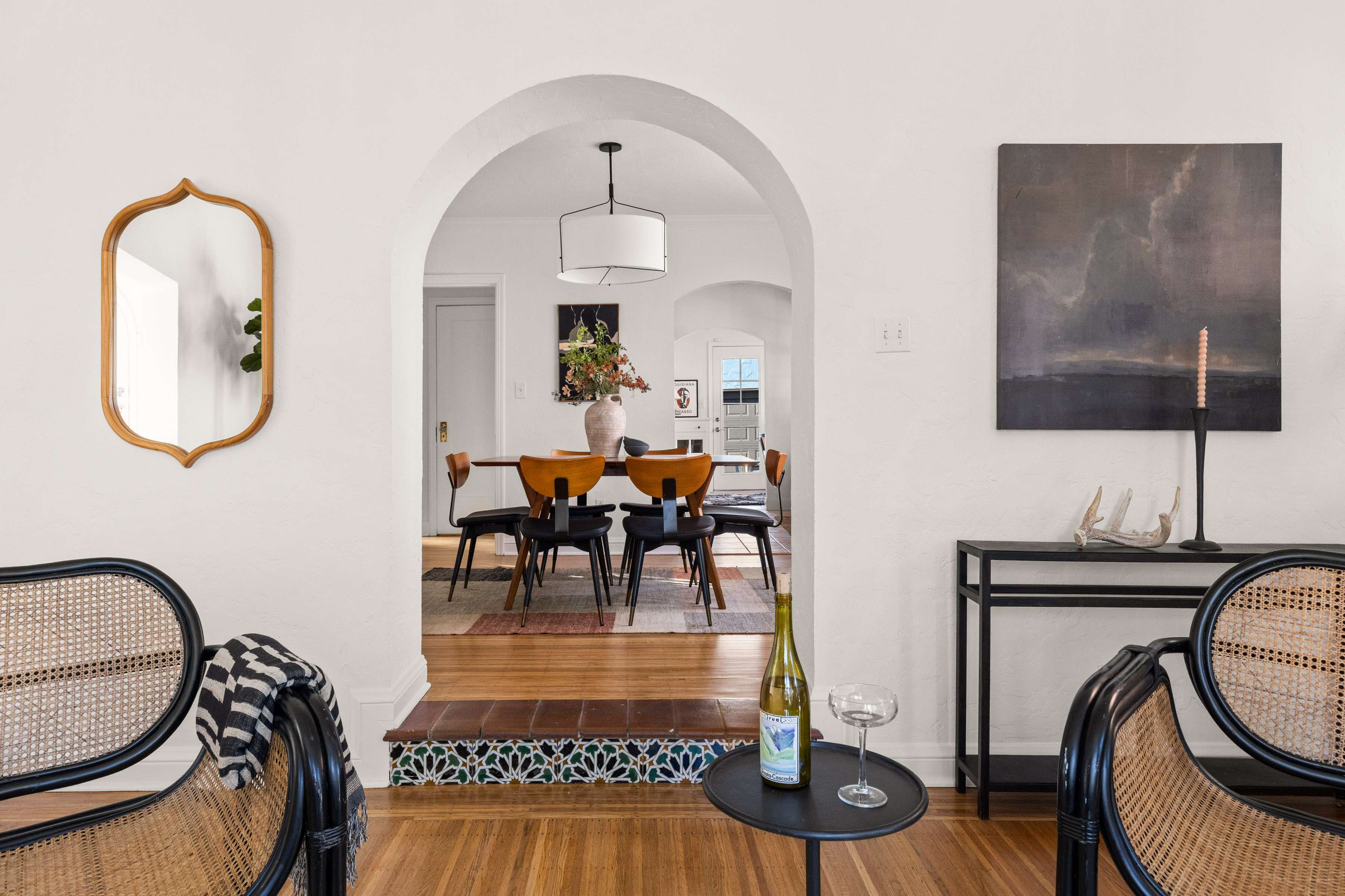 A pleasant patio welcomes you upon arrival; imagine enjoying your morning coffee, underneath the palm trees. There’s a gracious entry through an arched front door to welcome you. The living room is elegant and features vaulted ceilings with exposed beams, a pretty pendant and decorative fireplace that anchors the space. Original matchstick hardwood floors, painted tile details, graceful archways, and vintage hardware continue the home’s classic charm throughout.