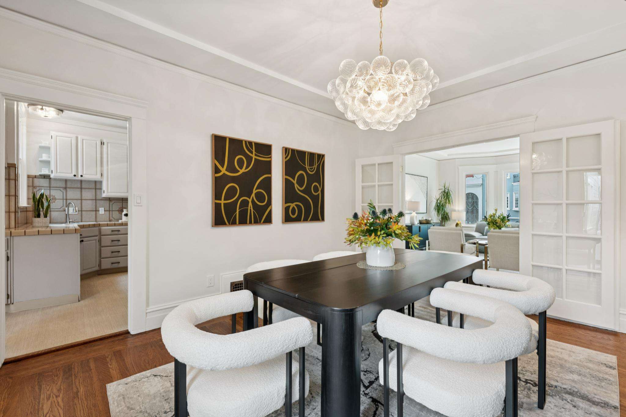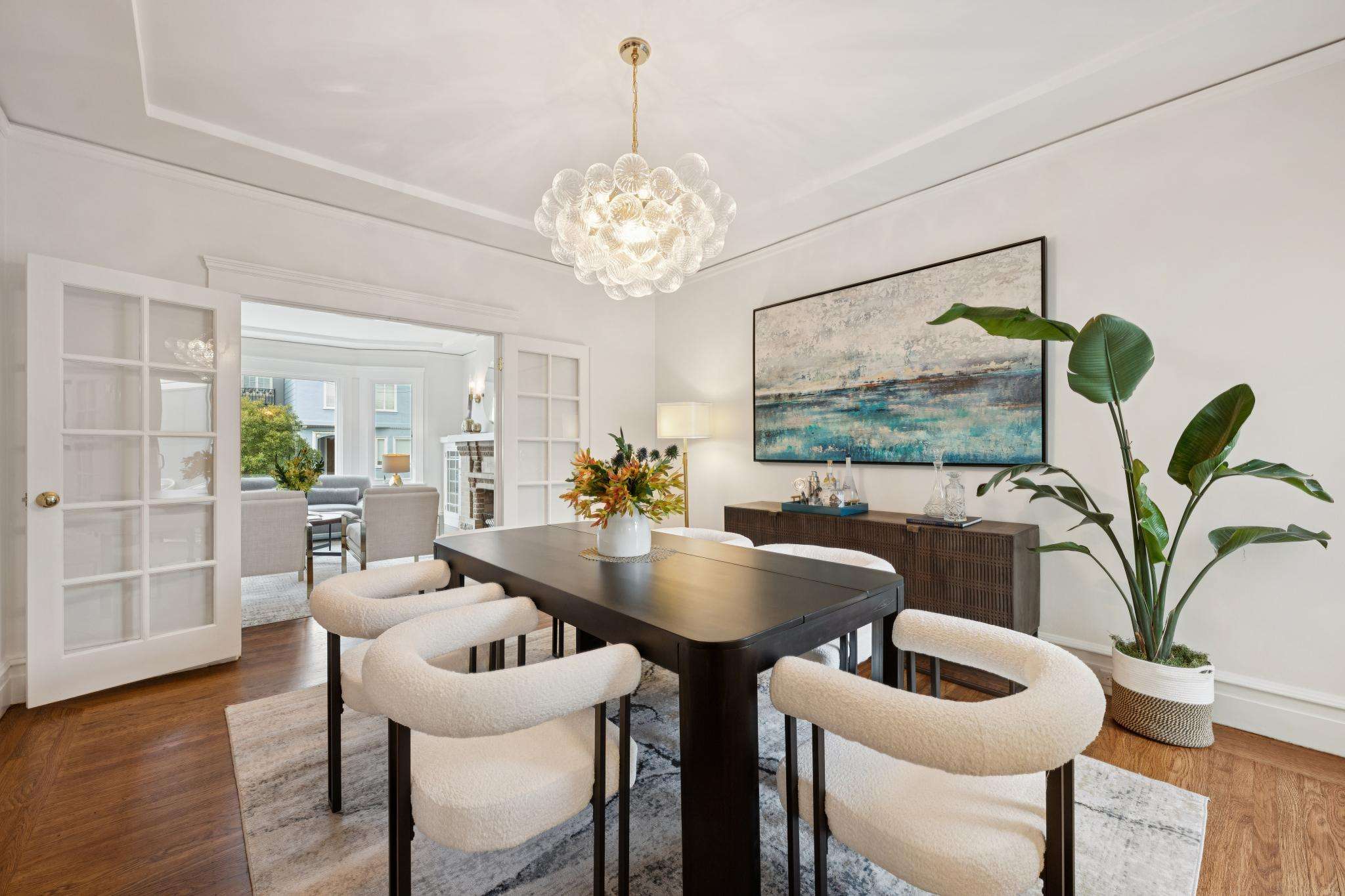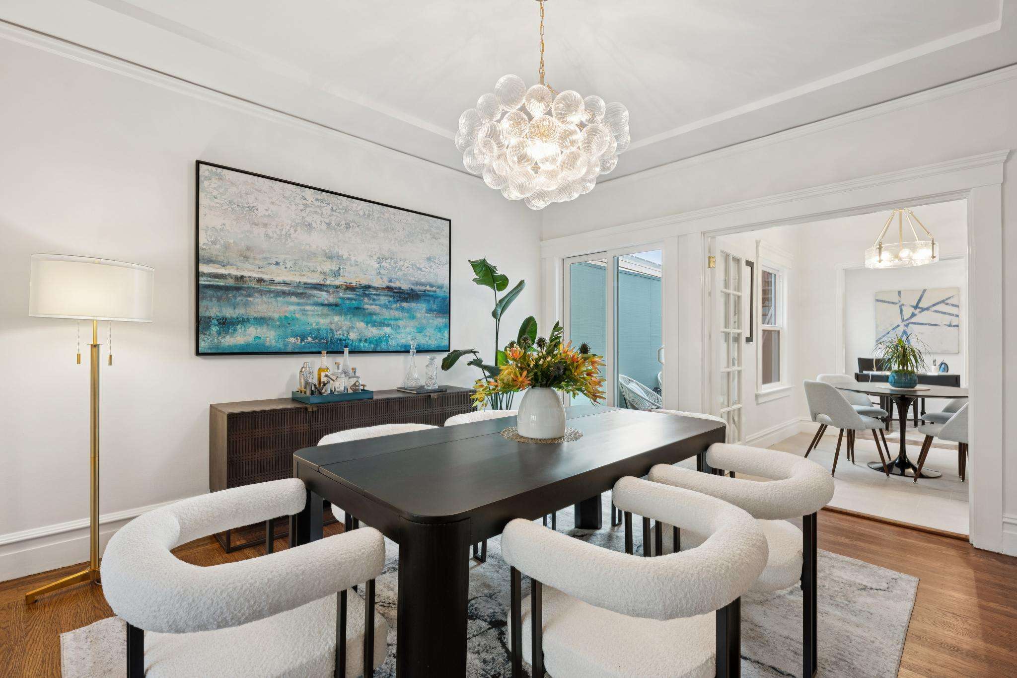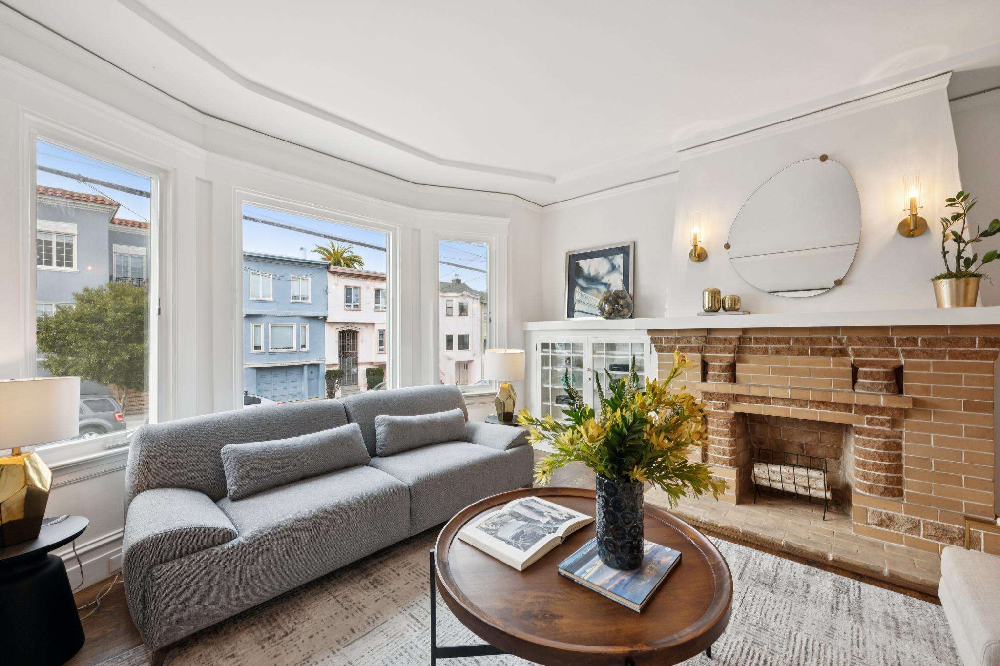 First time on the market in over 60 years. Built circa 1921, this distinguished Edwardian home offers approximately 3,298 square feet of living space and a rare architectural layout defined by intentionally scaled living environments on every level, seldom found in San Francisco homes. Rich in original period detail, the home features refinished original hardwood floors throughout and outdoor terraces on multiple levels, creating a seamless connection to light, air, and indoor–outdoor living.The main level includes formal living and dining rooms with deck access, a spacious kitchen with adjoining breakfast area, a private office, and a quietly positioned primary bedroom suite with an east-facing deck, sitting area, two closets, and a spa-inspired bathroom.The upper level offers three well-proportioned bedrooms, a full bathroom with double sinks and a soaking tub, and a magnificent family room that serves as a true architectural centerpiece. With cathedral ceilings, a fireplace, deck access, and an adjoining bonus kitchen, this space provides exceptional scale, privacy, and natural light while remaining connected to the rest of the home. This space is thoughtfully designed to support both everyday living and gathering in a way rarely found in San Francisco residences.On the lower level, a generous social hall with a built-in bar and direct access to the private, spacious backyard offers an ideal setting for gathering and everyday enjoyment. This thoughtfully layered floor plan creates a sense of privacy and flexibility, allowing the home to adapt gracefully to evolving needs. The garage provides tandem parking for two cars, along with storage, laundry, and a powder room. Defined by timeless Edwardian architecture, generous proportions, and thoughtful design, this home supports a refined lifestyle centered on comfort, flexibility, and long-term livability.