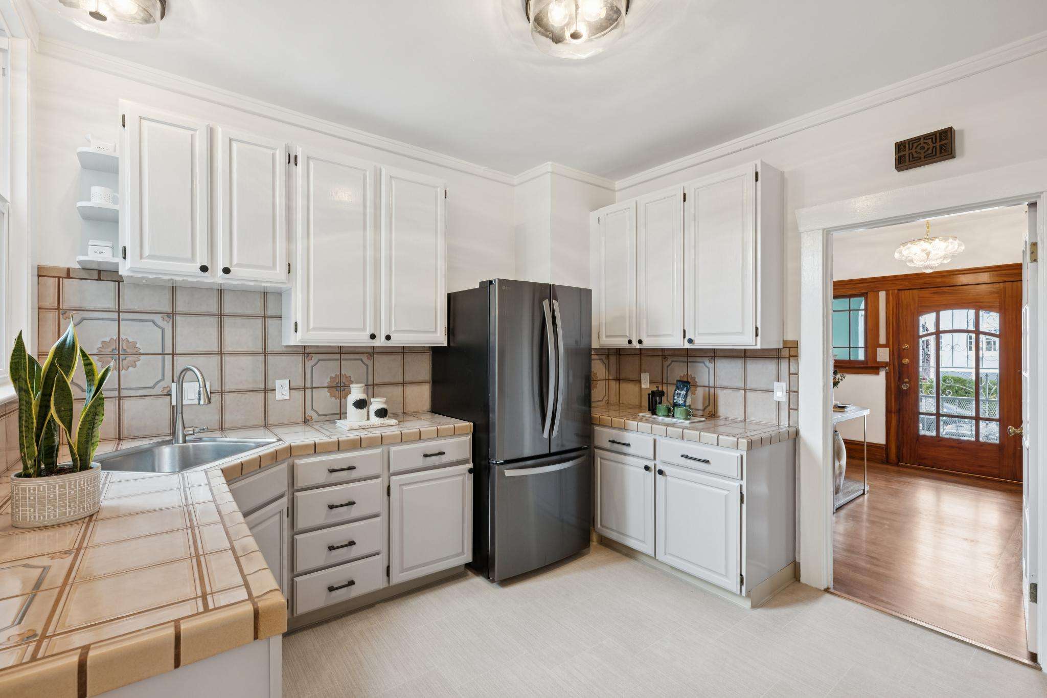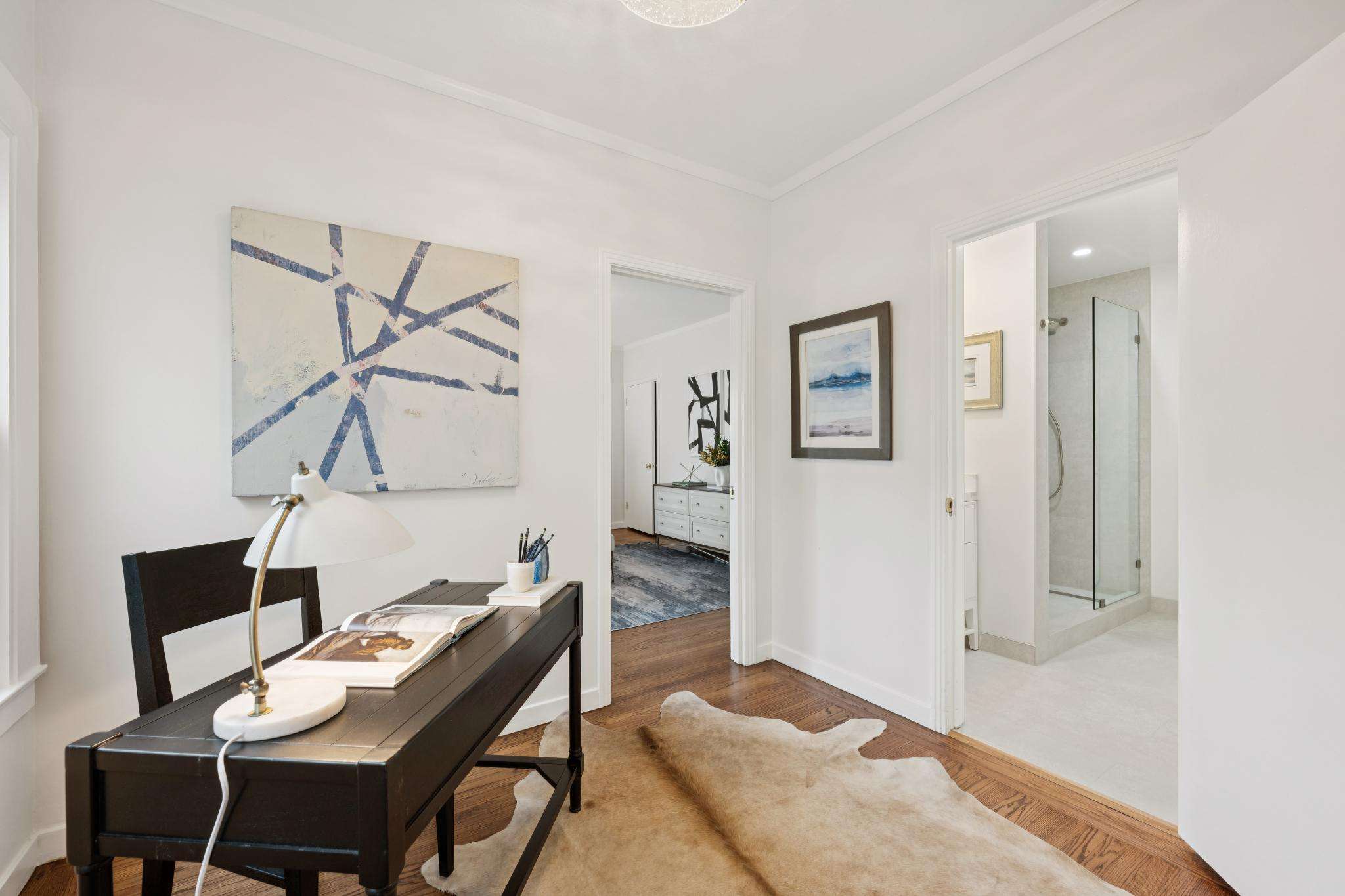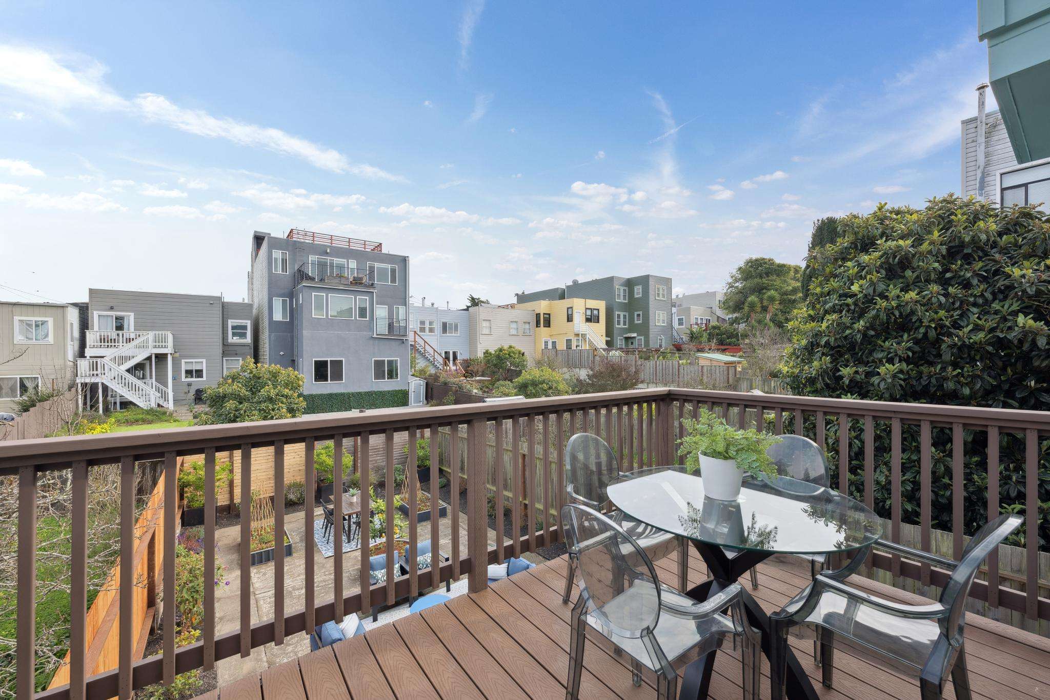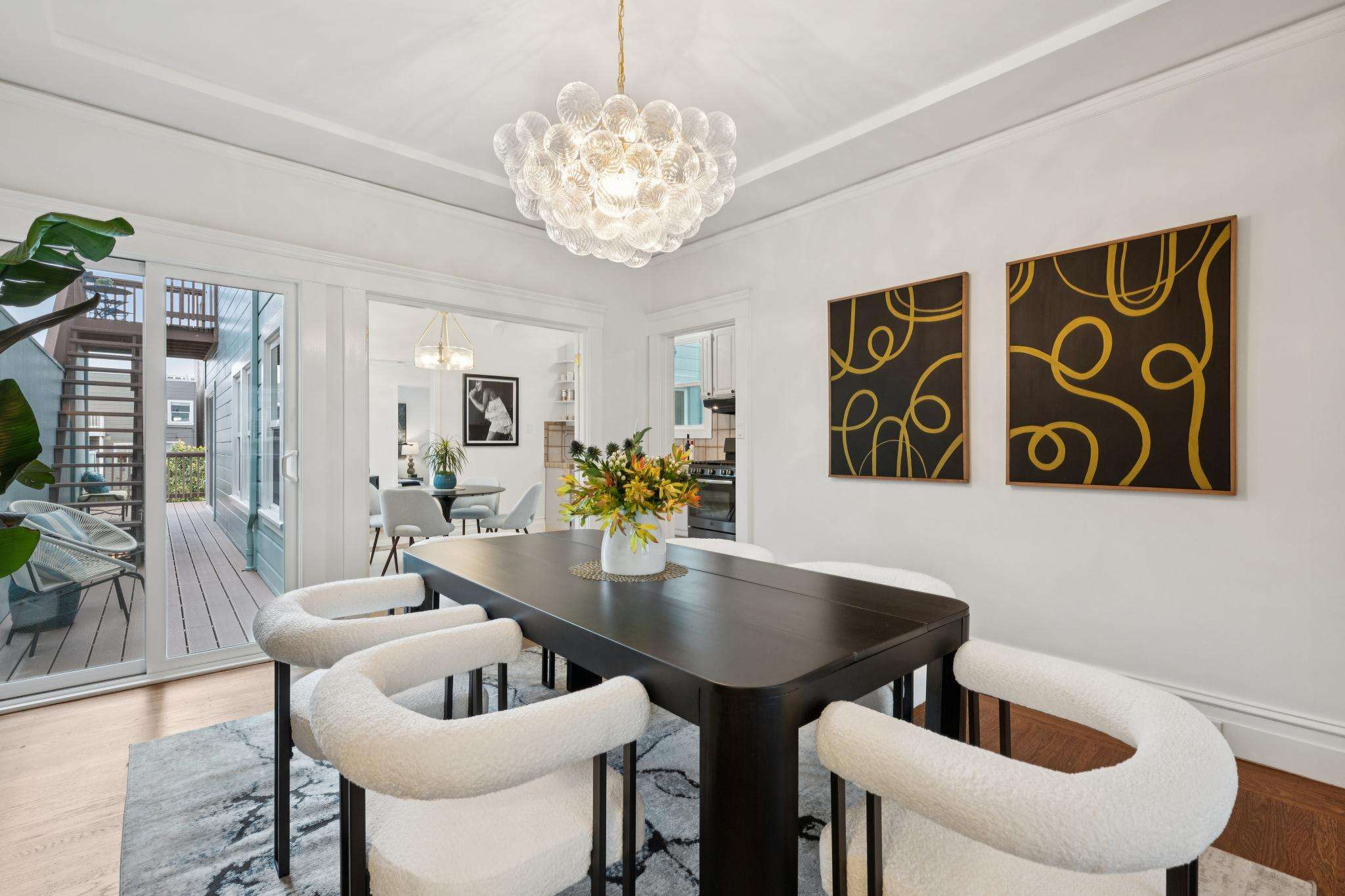 First time on the market in over 60 years. Built circa 1921, this distinguished Edwardian home offers approximately 3,298 square feet of living space and a rare architectural layout defined by intentionally scaled living environments on every level, seldom found in San Francisco homes. Rich in original period detail, the home features refinished original hardwood floors throughout and outdoor terraces on multiple levels, creating a seamless connection to light, air, and indoor–outdoor living.The main level includes formal living and dining rooms with deck access, a spacious kitchen with adjoining breakfast area, a private office, and a quietly positioned primary bedroom suite with an east-facing deck, sitting area, two closets, and a spa-inspired bathroom.The upper level offers three well-proportioned bedrooms, a full bathroom with double sinks and a soaking tub, and a magnificent family room that serves as a true architectural centerpiece. With cathedral ceilings, a fireplace, deck access, and an adjoining bonus kitchen, this space provides exceptional scale, privacy, and natural light while remaining connected to the rest of the home. This space is thoughtfully designed to support both everyday living and gathering in a way rarely found in San Francisco residences.On the lower level, a generous social hall with a built-in bar and direct access to the private, spacious backyard offers an ideal setting for gathering and everyday enjoyment. This thoughtfully layered floor plan creates a sense of privacy and flexibility, allowing the home to adapt gracefully to evolving needs. The garage provides tandem parking for two cars, along with storage, laundry, and a powder room. Defined by timeless Edwardian architecture, generous proportions, and thoughtful design, this home supports a refined lifestyle centered on comfort, flexibility, and long-term livability.