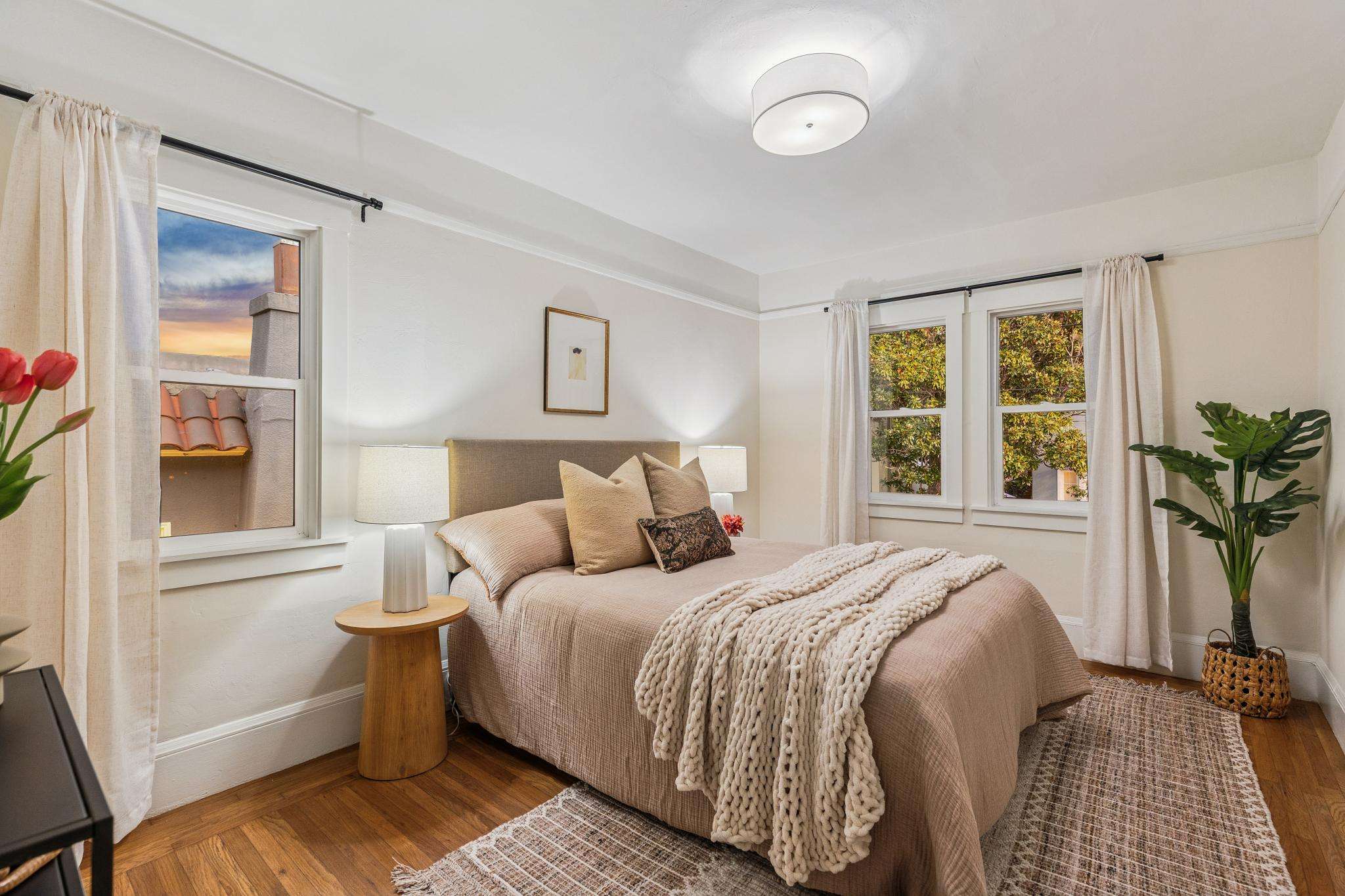 The kitchen features quartz counters, subway tile backsplash, stainless steel appliances and access to the backyard/deck – a great spot to enjoy your coffee or a meal outdoors. 2 spacious, sunny bedrooms have ample space for an office or seating area.