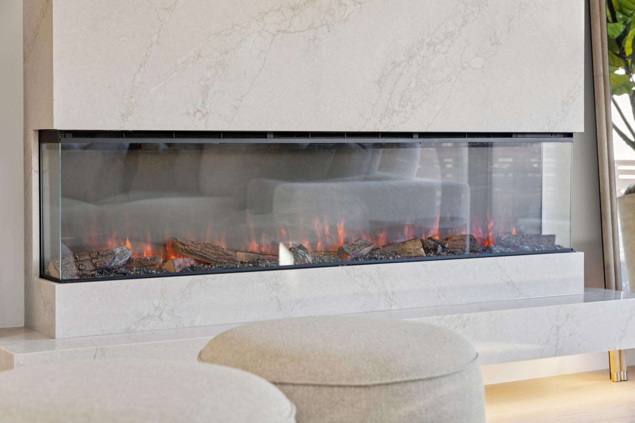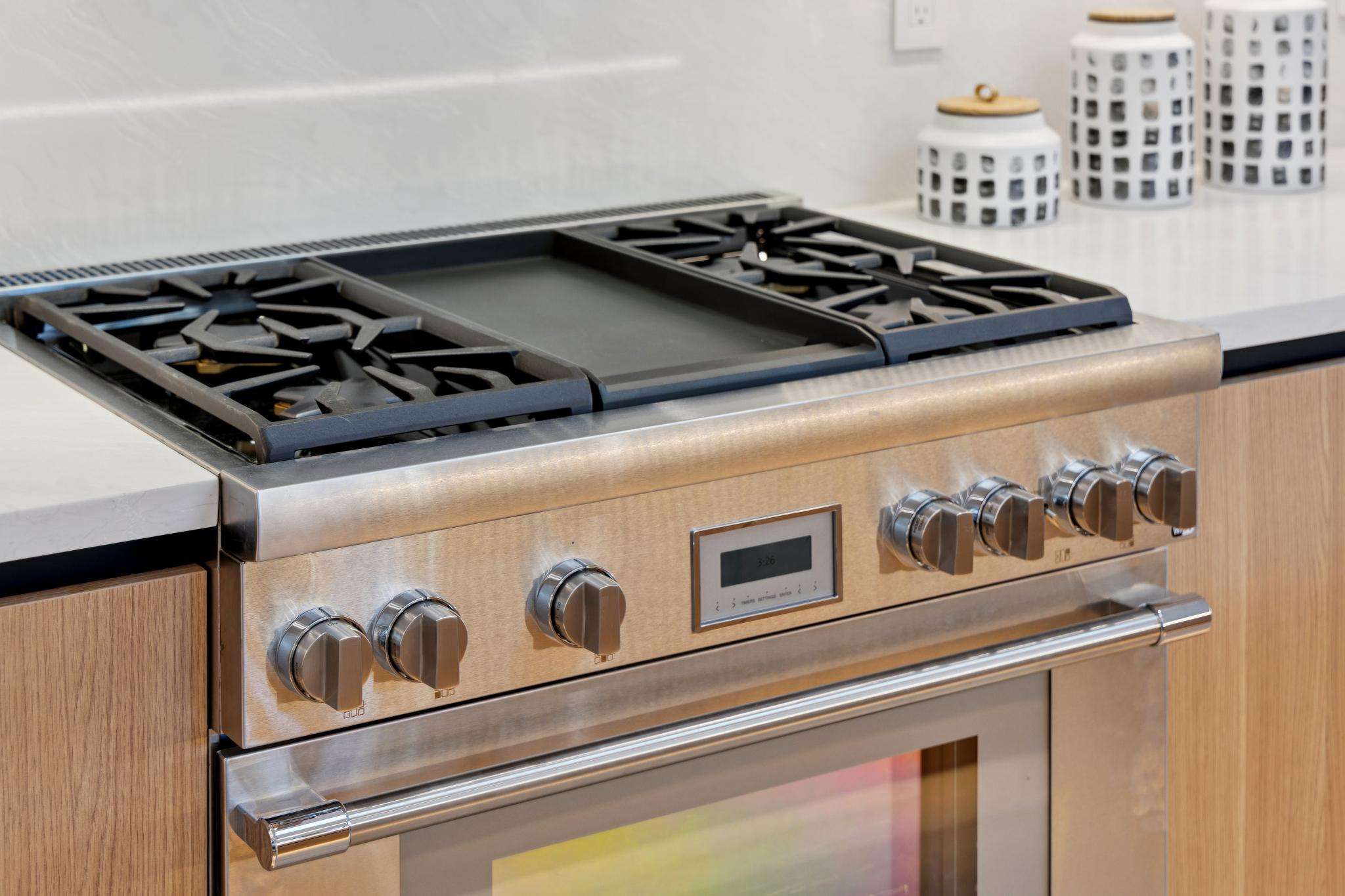 A desirable reverse floor plan places the kitchen, dining, and living areas on the main level, opening directly to the backyard and creating an expansive, functional layout ideal for entertaining and family living. A striking floating fireplace anchors the living room and invites moments of relaxation. At the heart of the home is a custom European-style kitchen, featuring top-of-the-line Thermador appliances, abundant cabinetry, a dramatic center island, and a pot filler for added convenience. Expansive folding glass doors open fully, blurring the line between indoor and outdoor living.