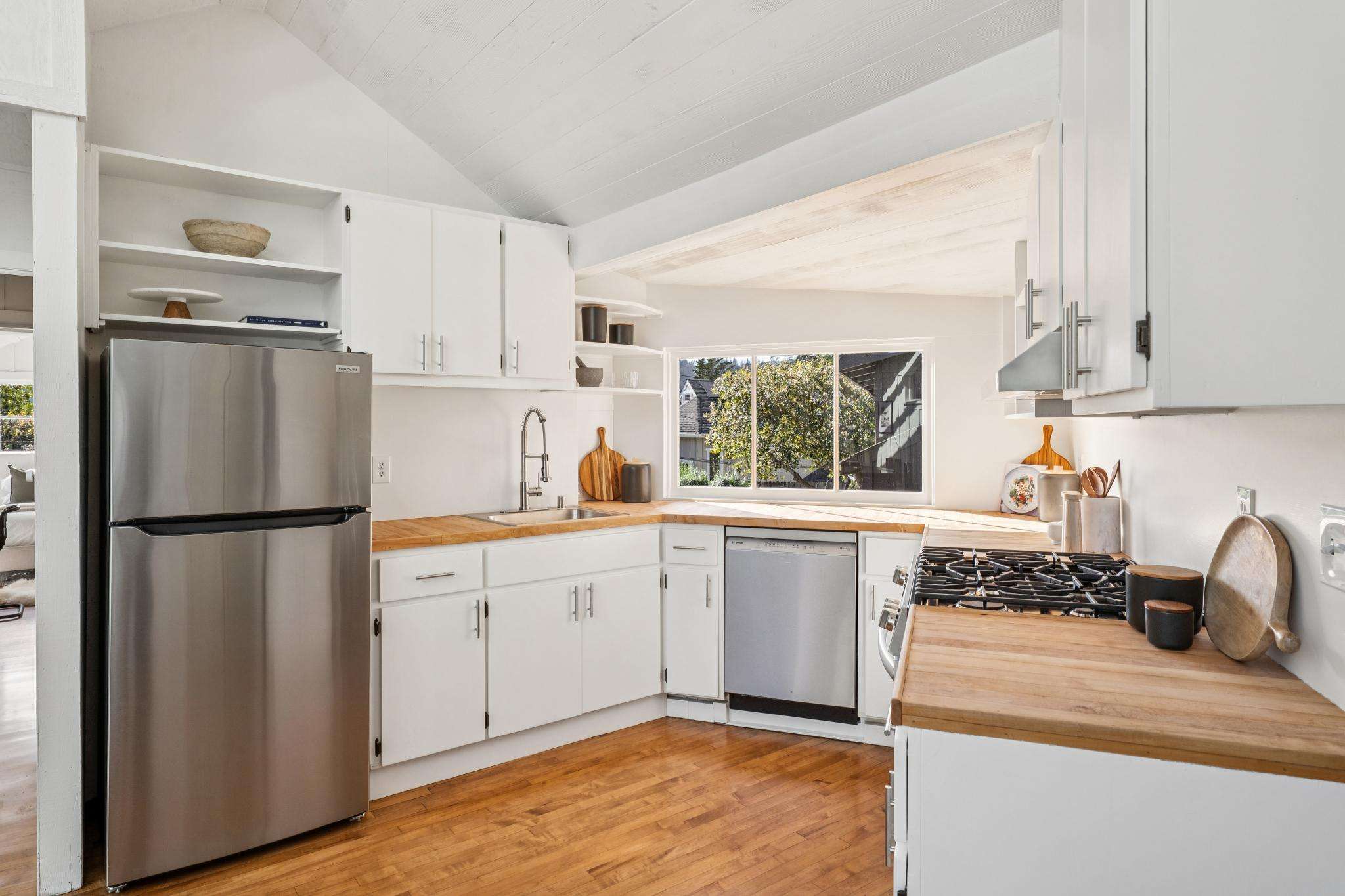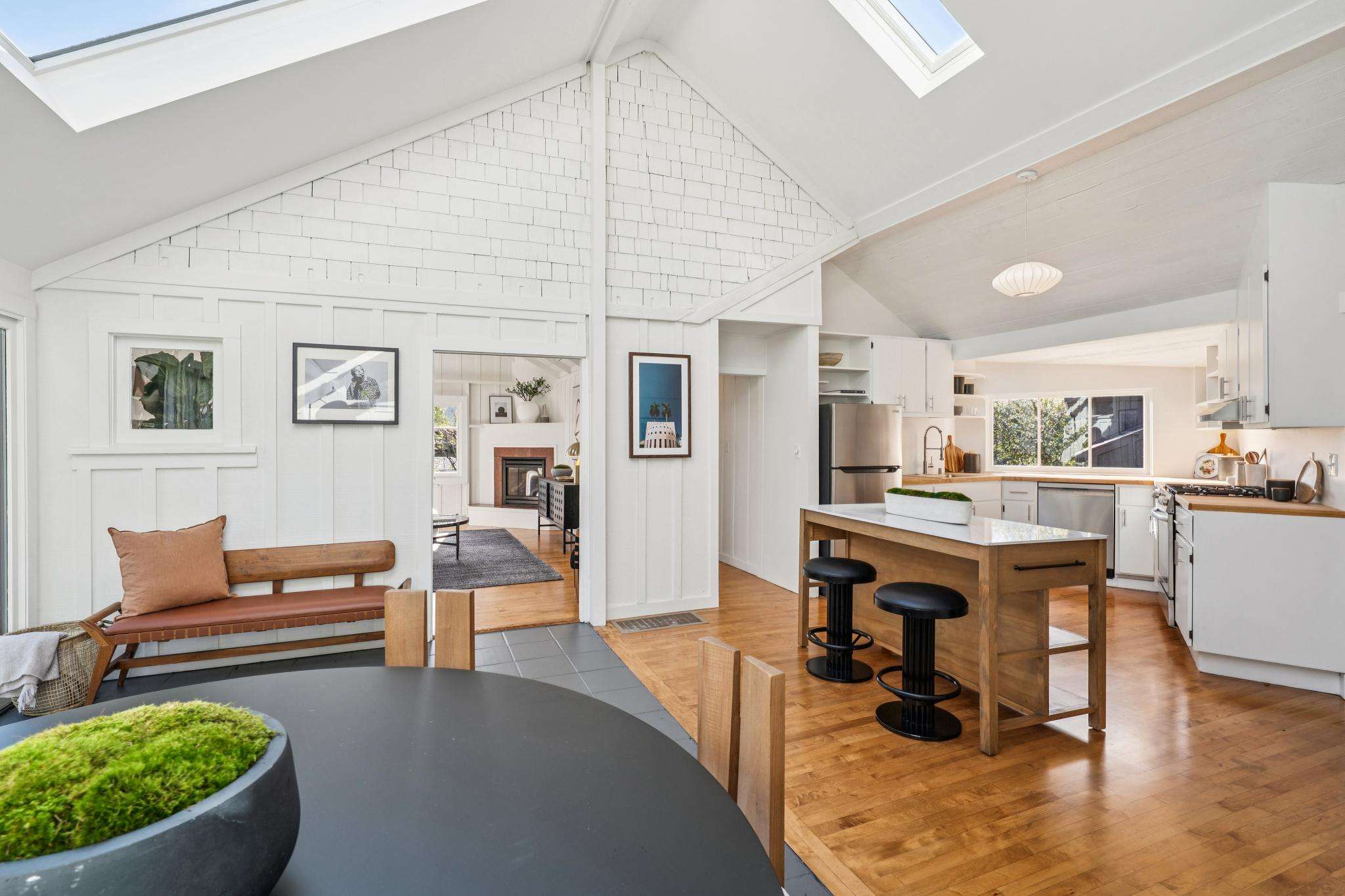 The kitchen pairs natural textures with modern function, featuring butcher block countertops, new appliances, and easy flow for everyday living and entertaining. Sliding glass doors open to a rear deck, while hardwood and tile flooring provide continuity and warmth throughout. Just beyond, the living room embodies the home’s architectural fusion with open beam ceilings, skylights, expansive windows, and a working fireplace creating an inviting atmosphere framed by garden views.