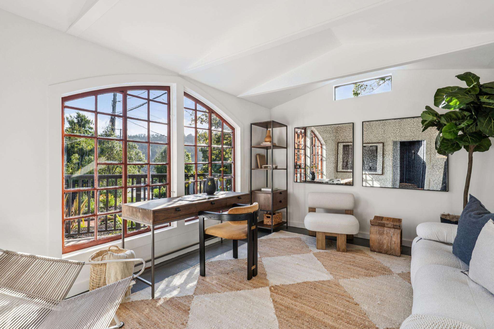 - Detached home office (former garage) with arched windows and vaulted ceilings