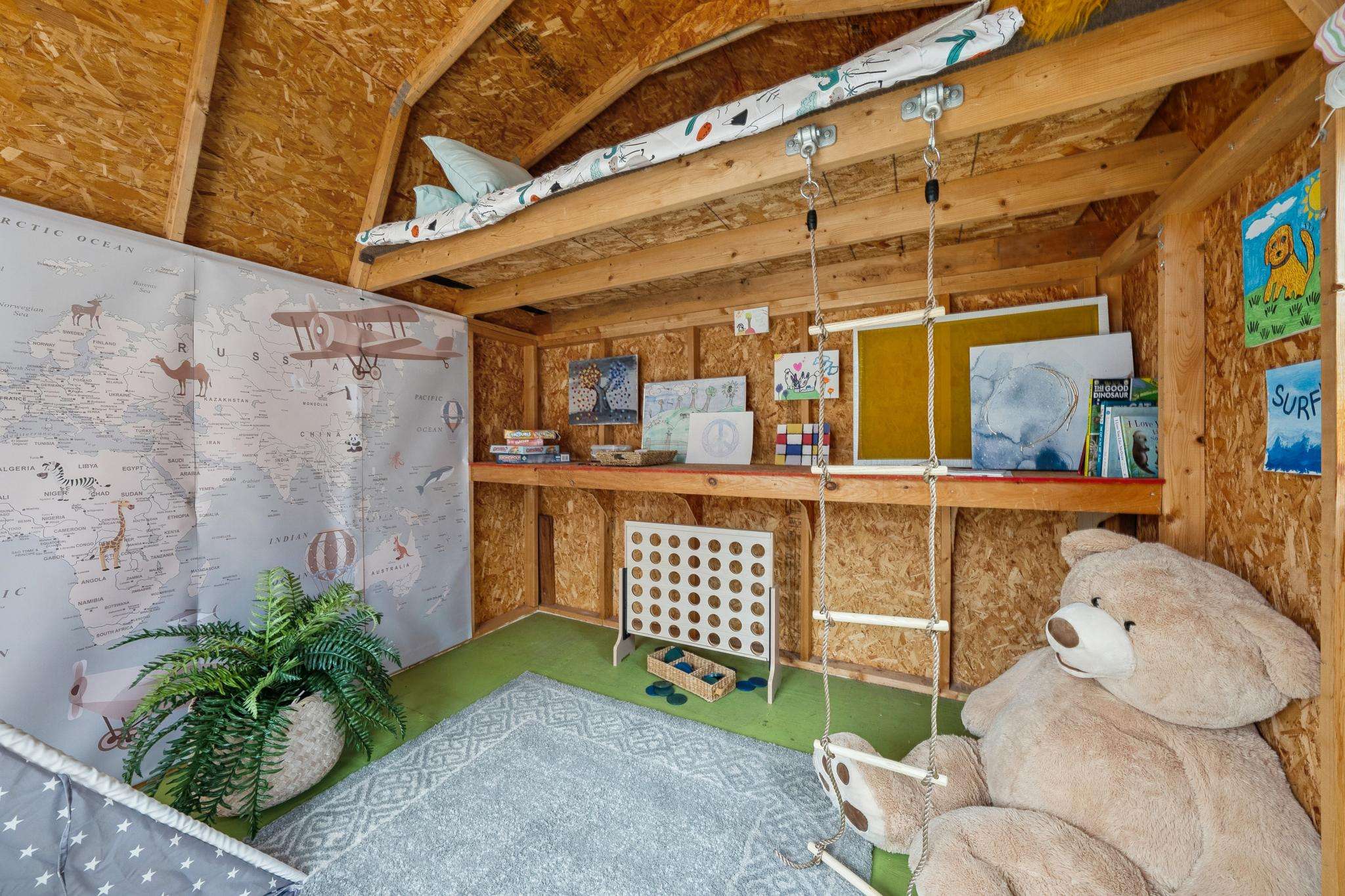 A charming kid’s clubhouse adds a touch of whimsy to this serene setting.