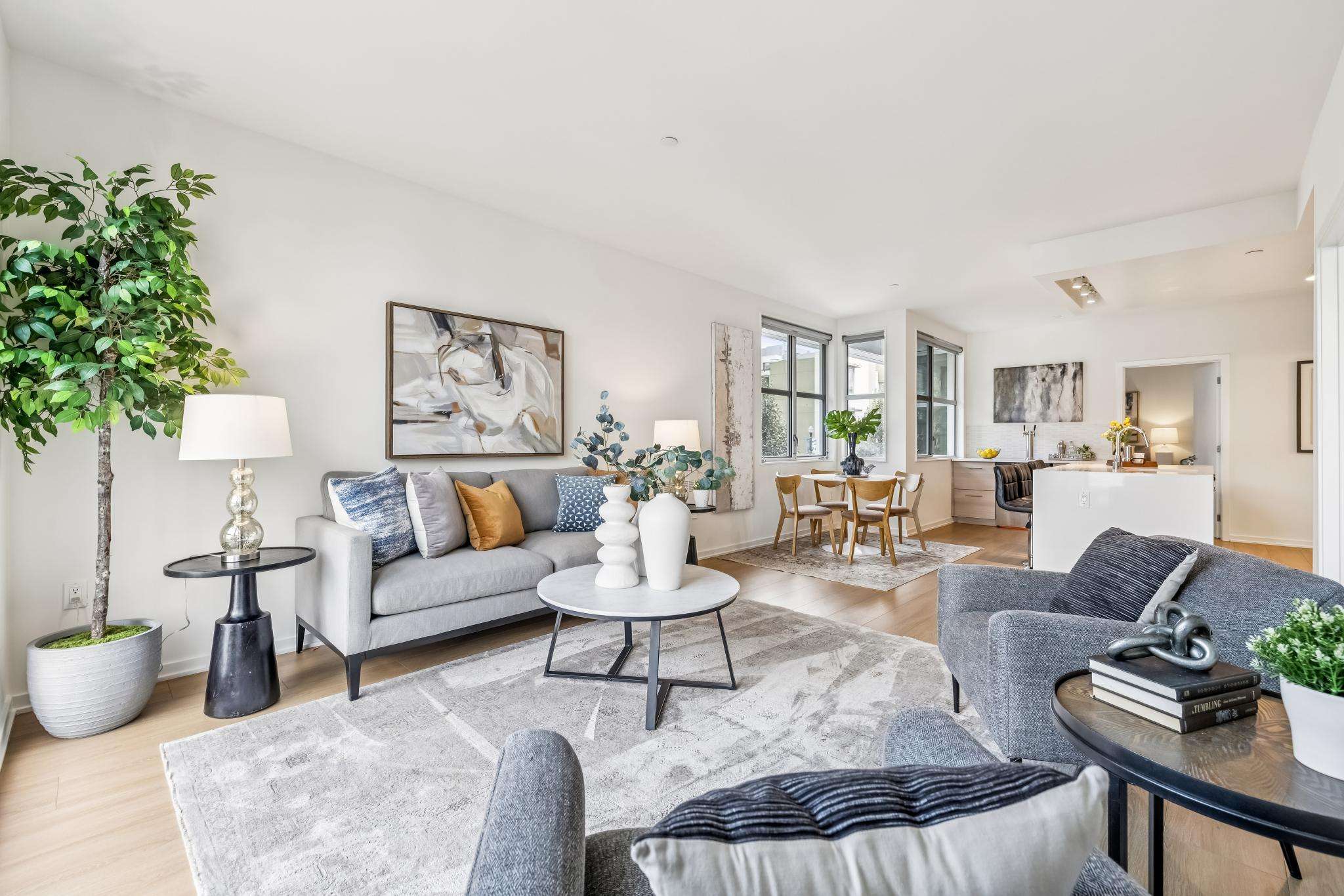 Overlooking a beautifully landscaped courtyard, this southeast-facing residence is wrapped in windows that flood the home with natural light all day long. The open-concept living room, dining area, and kitchen create an ideal setting for both lively gatherings and relaxed evenings in.