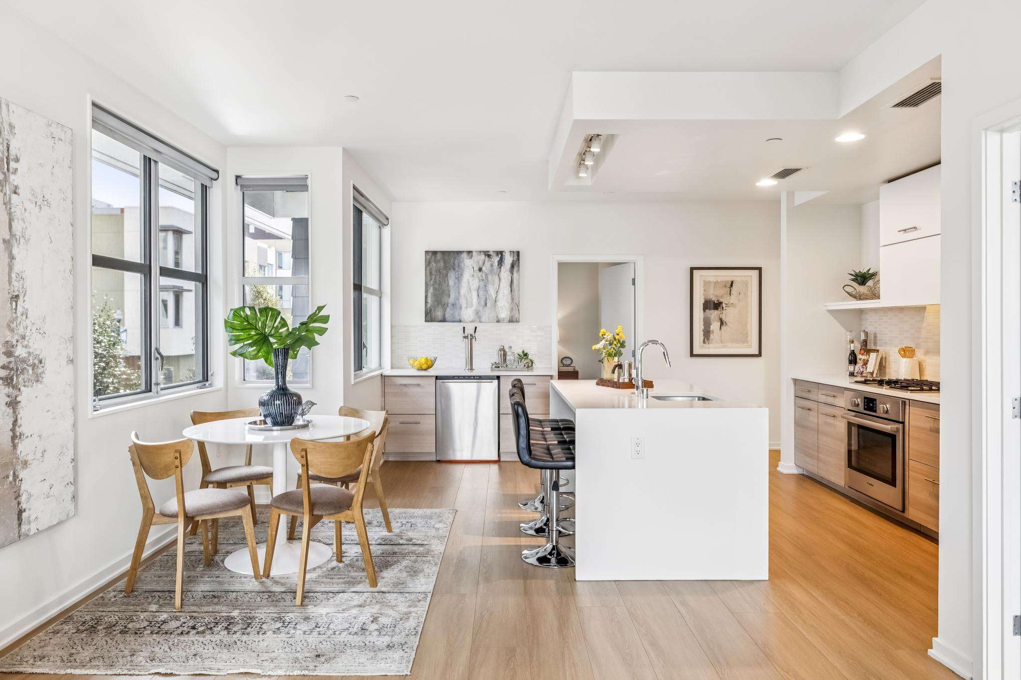 At the heart of the home, the chef’s kitchen delivers on both form and function: a quartz-topped center island with dining bar, stainless sink, Bosch dishwasher, sleek modern cabinetry with contemporary tile backsplash, Bosch gas cooktop with electric oven, and a dual-door Bosch refrigerator. A custom wet bar with kegerator and additional freezer takes entertaining to the next level—because hosting should always be this easy.