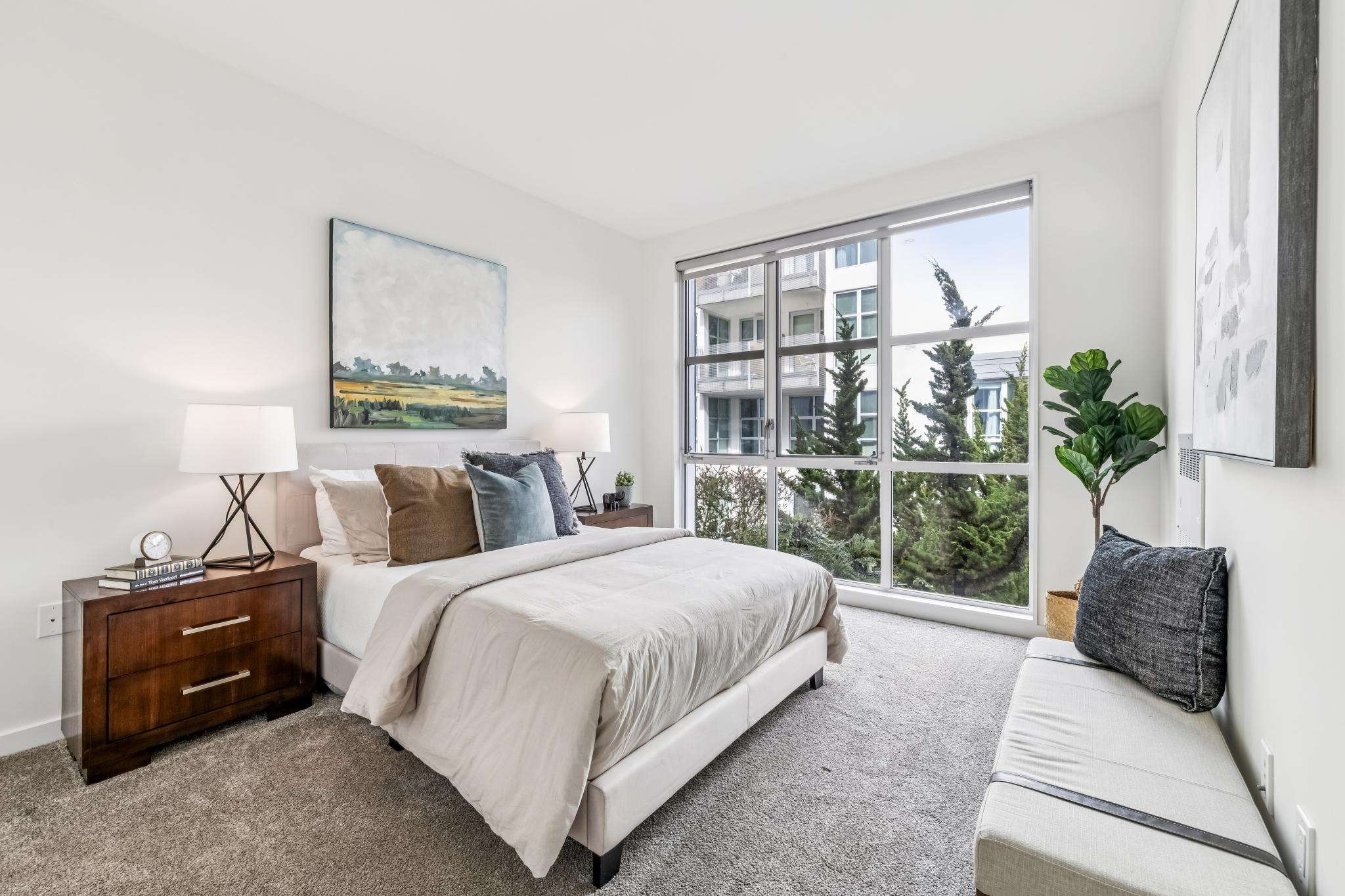 Step inside this sun-drenched, corner 2-bedroom, 2-bathroom condominium where modern design meets effortless livability. A formal entry hallway sets the tone, complete with a custom built-in wood bench and an oversized coat closet—both stylish and supremely practical.