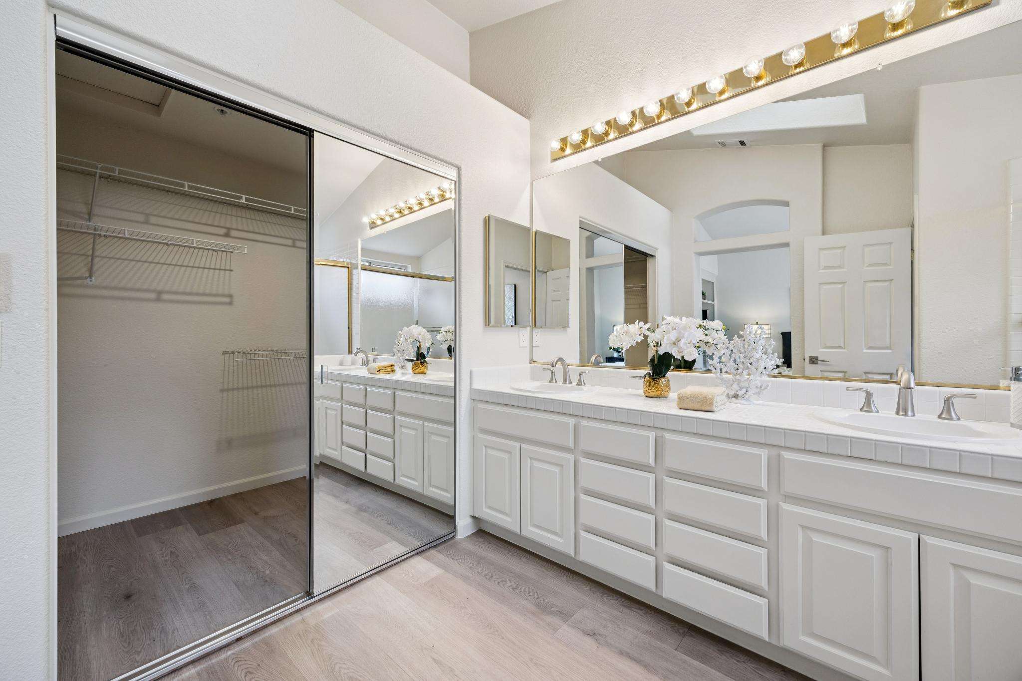 - Primary suite with high ceilings, built-in bookcase. Large bathroom with walk-in closet, long vanity with double sinks, shower and soaking tub