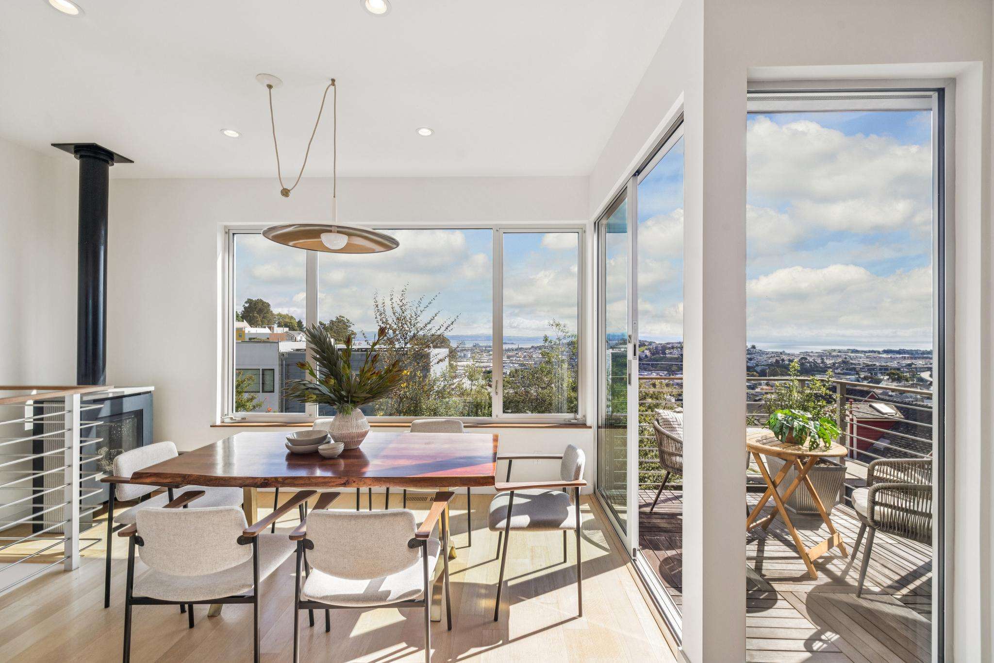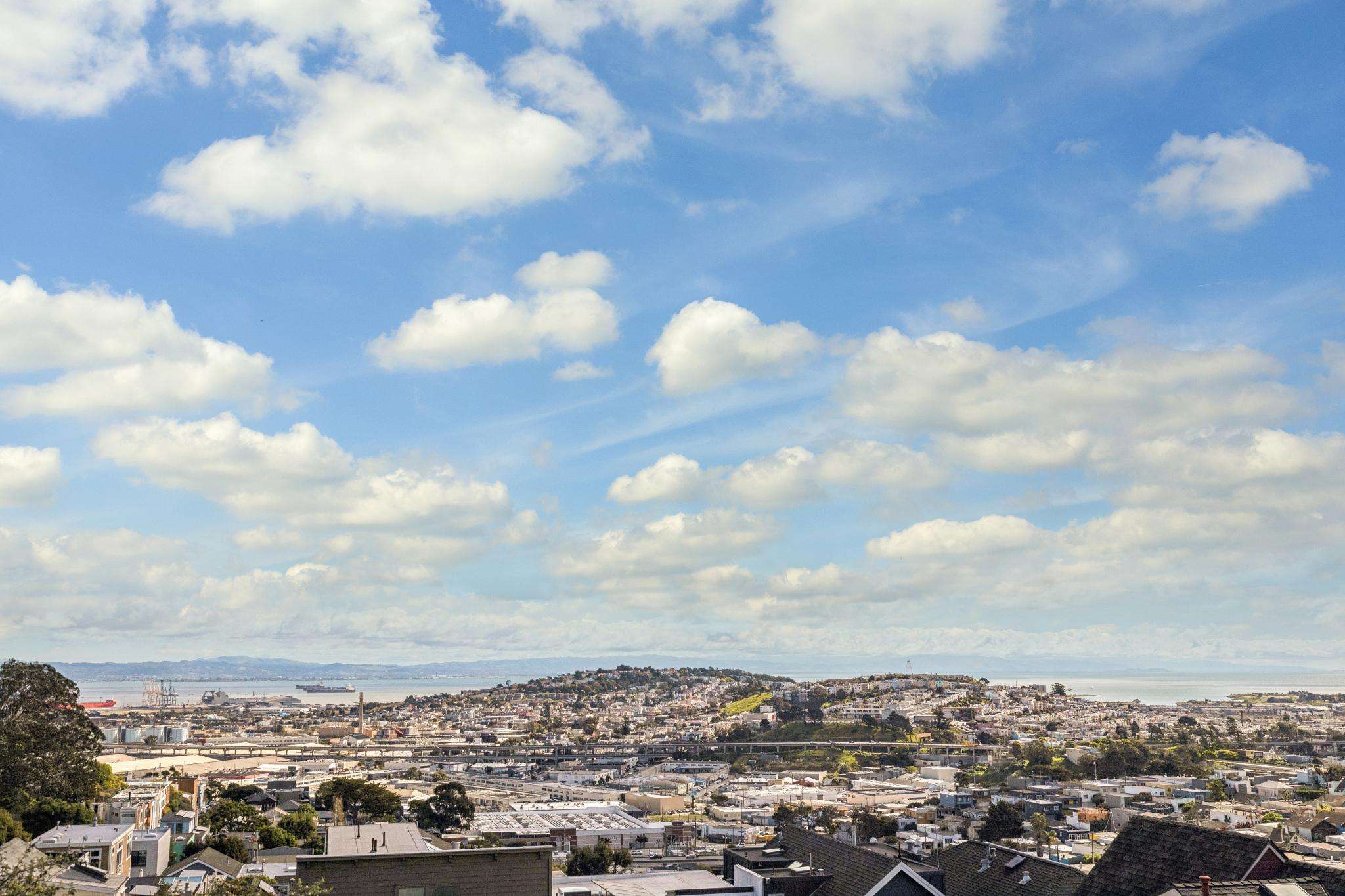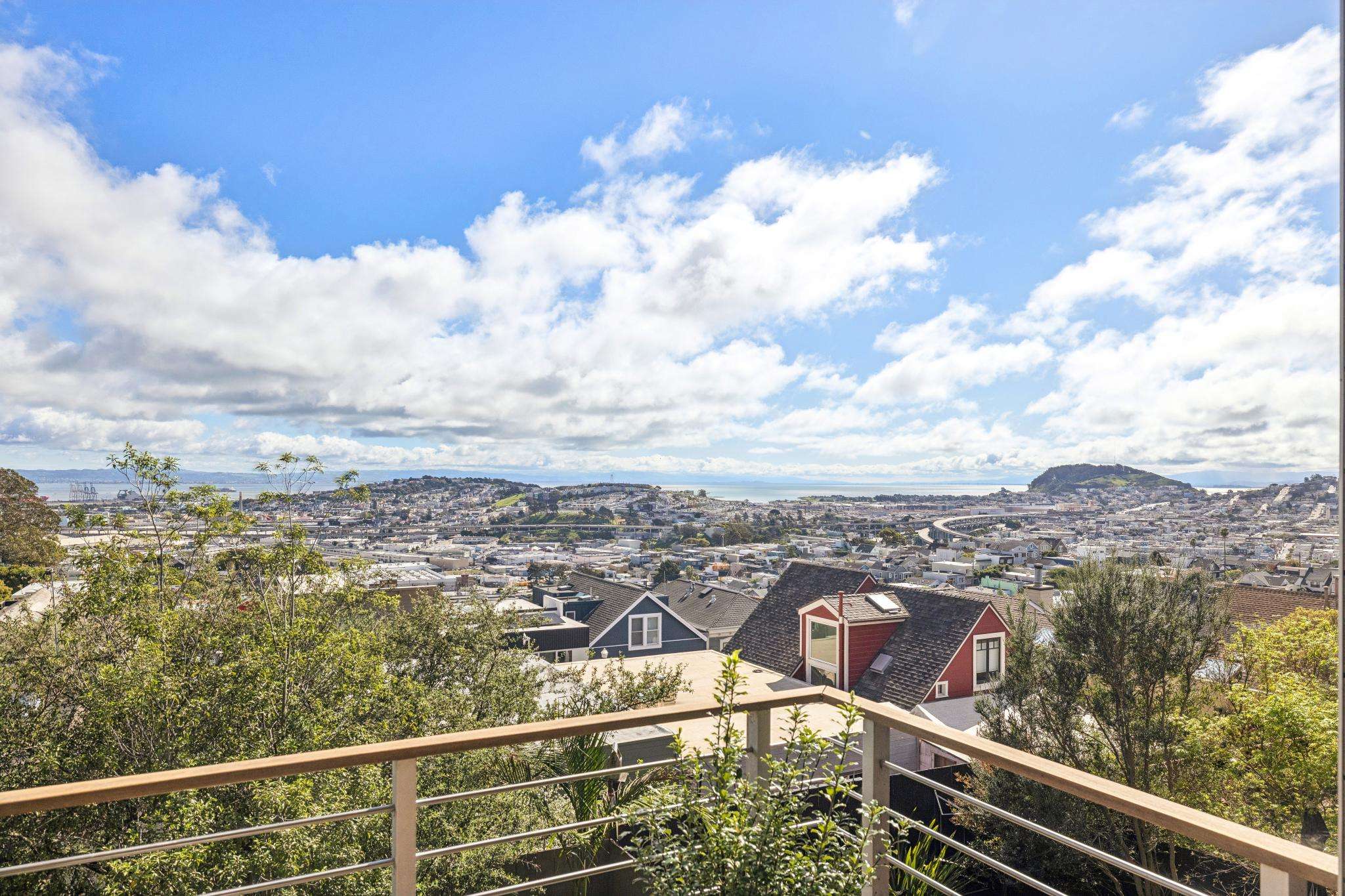 Just a block and a half north of Cortland with a 92 WalkScore, and steps to Bernal Heights Park, this remodeled three bedroom, three bath view home is everything you have been waiting for! Set on a rare thirty foot wide lot per tax records, the home opens with a clear line of sight straight through to the Bay. Enter the welcoming living room anchored by wide plank oak floors and abundant natural light. The remodeled eat-in kitchen features quartz countertops, Thermador range, stainless appliances, new tile backsplash, generous freshly painted wood cabinetry, and abundant workspace for both everyday living and entertaining. The dining room is a true centerpiece. Lined with windows and warmed by a fireplace, it captures sweeping views of the Bay and surrounding hillsides. A Fleetwood glass door opens to a deck perfectly positioned for grilling or simply taking in the view, creating seamless indoor outdoor living. There are two spacious bedrooms, one has an ensuite bath with peek-a-boo Bay views, and an additional second full tiled bath completes the main level. Downstairs, a sumptuous primary suite overlooks the lush garden, offering glimpses of the Bay, and opens to an ensuite, renovated full tiled bath. From this level, there is also direct access, outside of the bedroom, to the landscaped garden and patio. The wonderful rear garden is replete with lilac bushes, a highly-productive lemon tree and other mature plantings, plus planter boxes ready for your own vegetables or flowers. At the top level, a generous, light filled stand up attic space with a window overlooking the Bay offers tremendous versatility as a playroom, family room, guest retreat, yoga/workout studio, or home office. Huge garage for 1+ cars with ample storage. 240V outlet for EV charging at the side of the home. All of this is just steps from Cortland Avenue’s village of shops, cafes, and restaurants, Bernal Hill Park, tech coaches, and MUNI lines. Easy access to Highways 101 and 280 and SFO. The whole package!