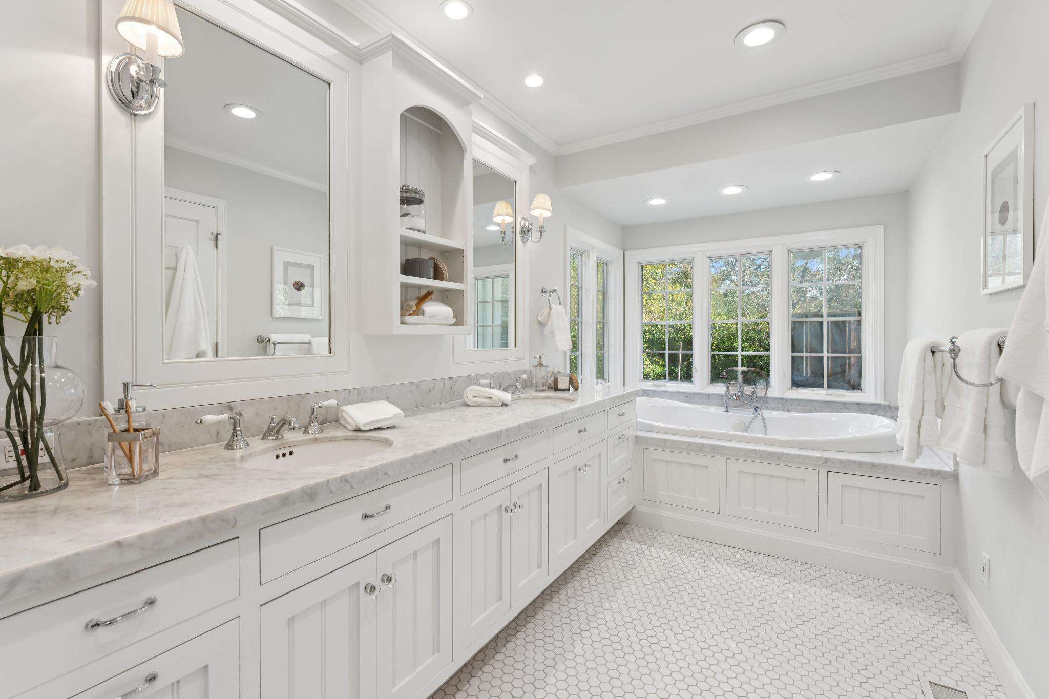 - Expansive primary suite with updated bathroom featuring dual sink vanity, separate make-up vanity, stall shower, and built-in tub