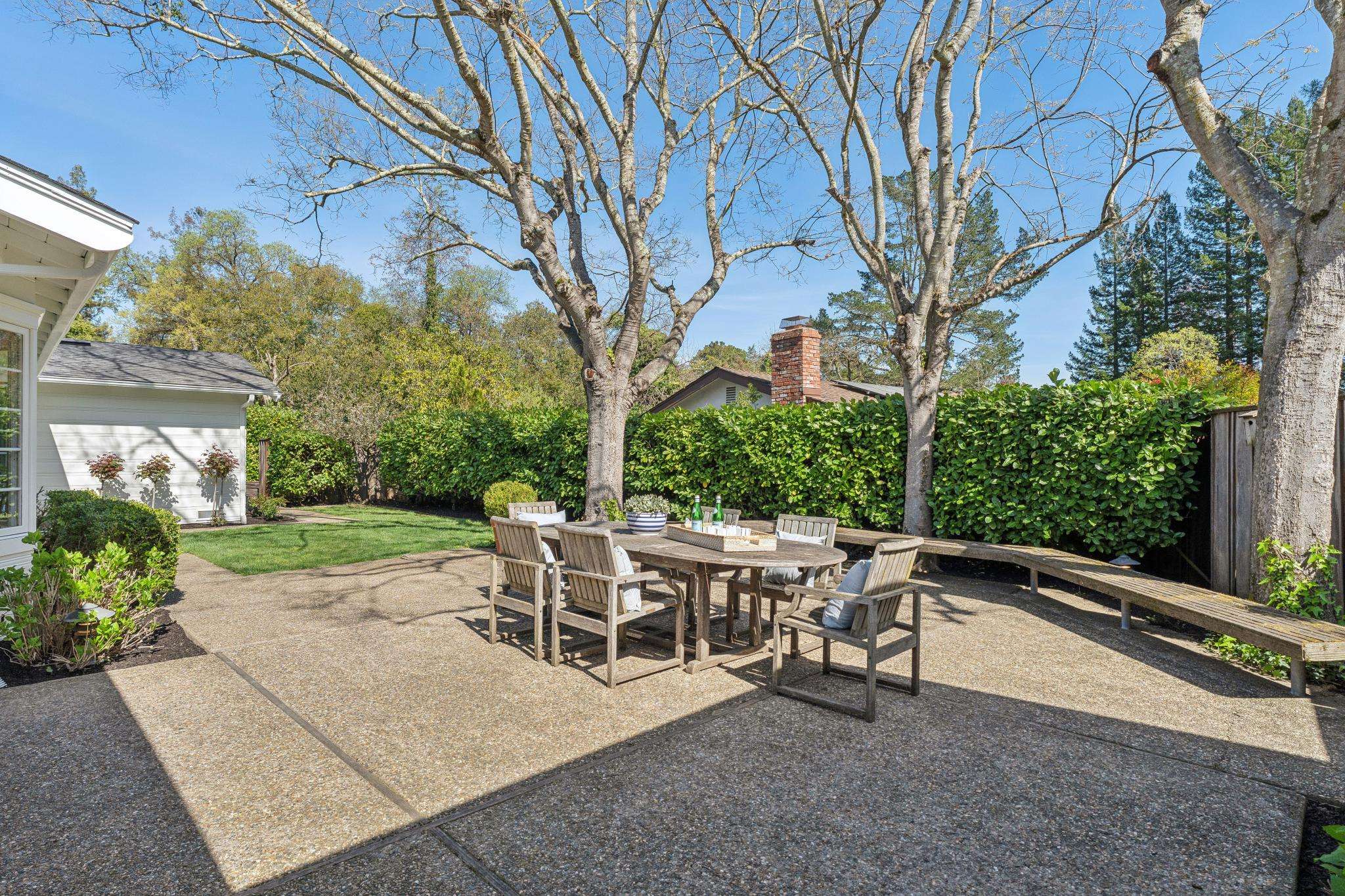 - Delightful backyard with sun-filled patio for entertaining and mature trees, roses and hydrangeas