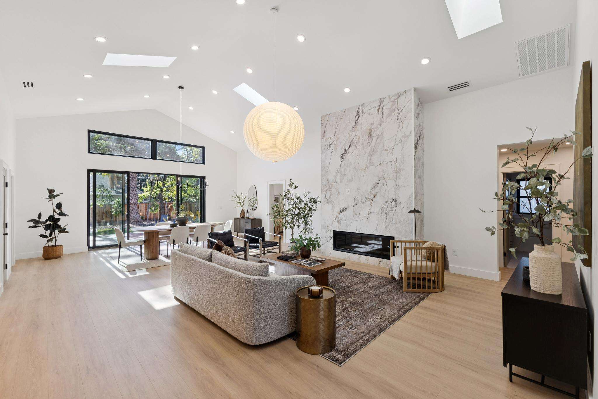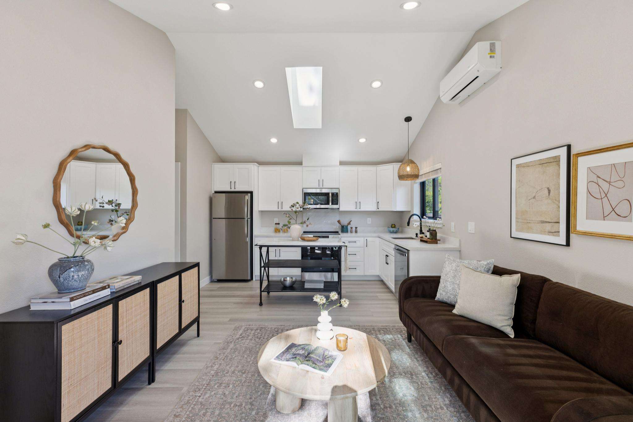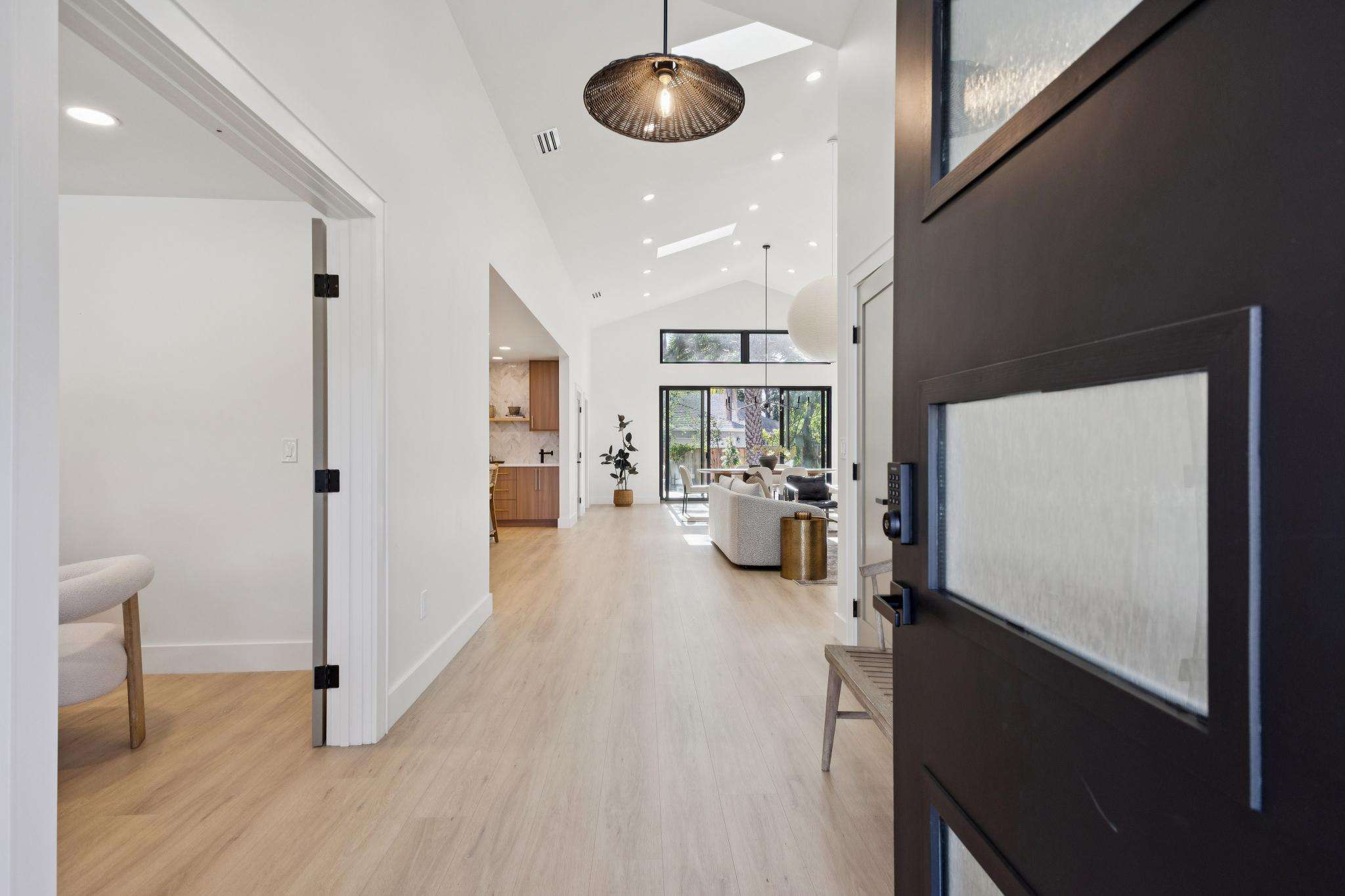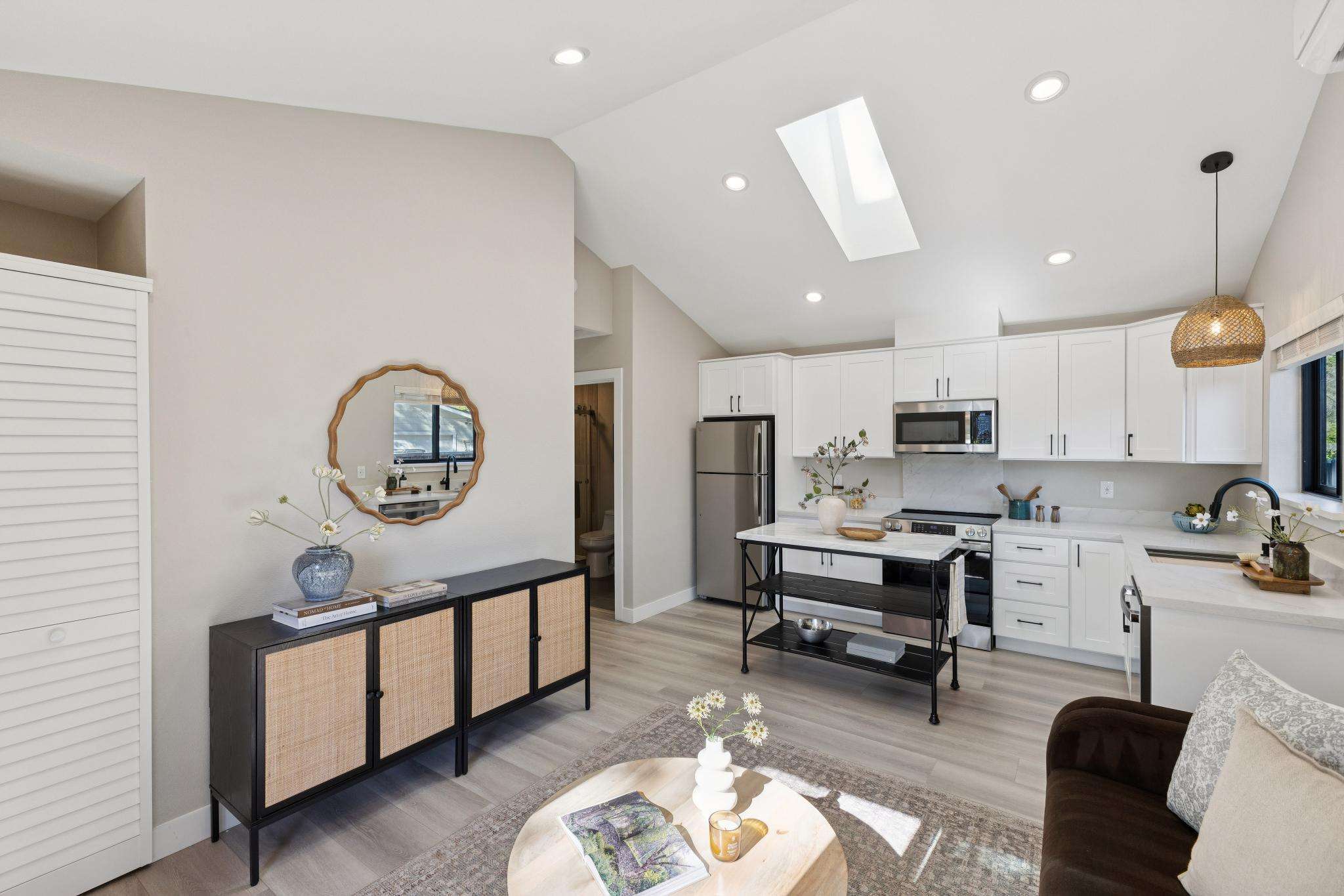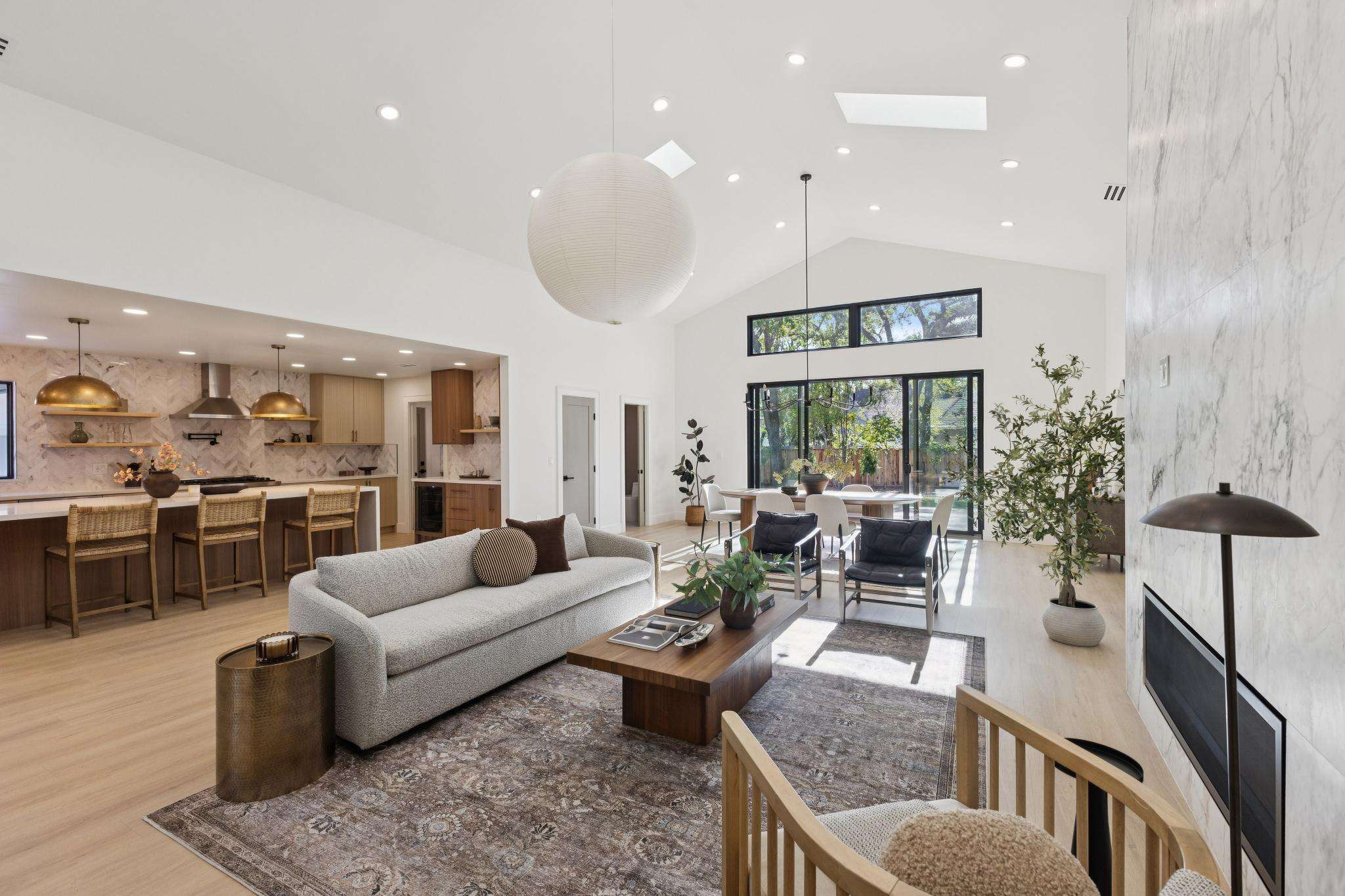 Rebuilt in 2025 on a Flat 0.4-Acre Lot with Single-Story Living and ADU. The 4-bedroom + office, 2.5-bathroom main home is complemented by a 1-bedroom, 1-bathroom private attached ADU with a kitchen and laundry. Ideal for guests, extended family, office space, or rental income. Soaring vaulted ceilings, skylights, and natural light highlight the home’s modern design. Open living spaces center around a dramatic floor-to-ceiling fireplace and expansive Andersen sliding glass doors for seamless indoor-outdoor living. Wide-plank engineered wood floors run throughout, and the chef’s kitchen features sleek quartz countertops and a refined minimalist aesthetic. The primary suite includes a freestanding soaking tub and dual vanity. Additional highlights include an attached two-car garage and a puppy shower. The tree-canopied outdoor area is perfect for dining, entertaining, and relaxation, with potential for another ADU or a possible lot split. Minutes to BART, downtown Walnut Creek, Lafayette, and Pleasant Hill, with easy freeway access. Close to award-winning schools and nationally recognized De La Salle and Carondelet, plus nearby trails, restaurants, shopping, and parks. A rare offering set on one of the most desirable expansive grounds.