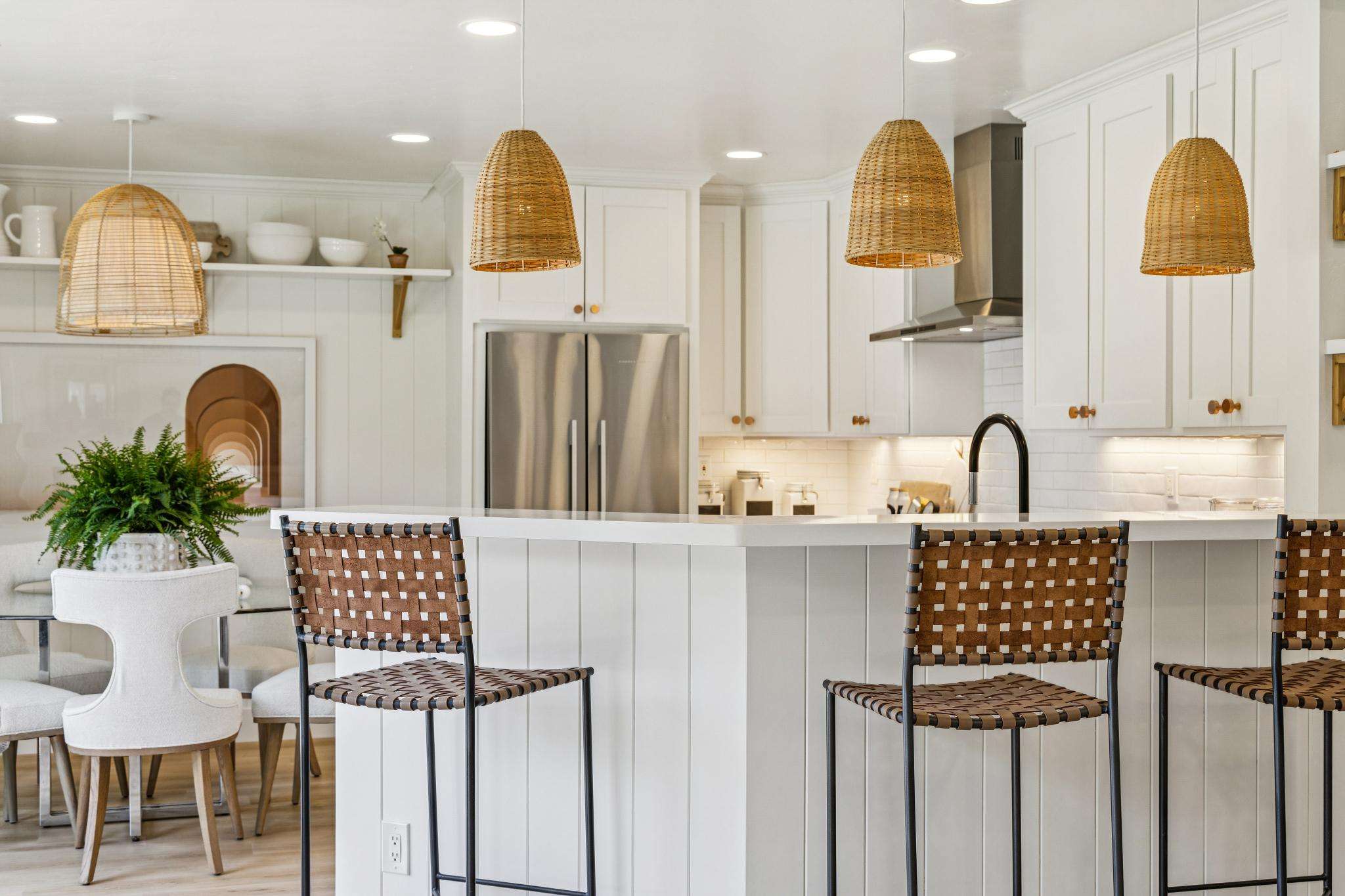 - Remodeled kitchen with freshly painted cabinets, deep porcelain sink, quartz countertop, subway tile backsplash, stainless appliances including Fisher & Paykel refrigerator and Ancona range, lazy Susan, matte black fixtures and copper hardware. Long peninsula with bar seating, basket pendants and shiplap wall detail