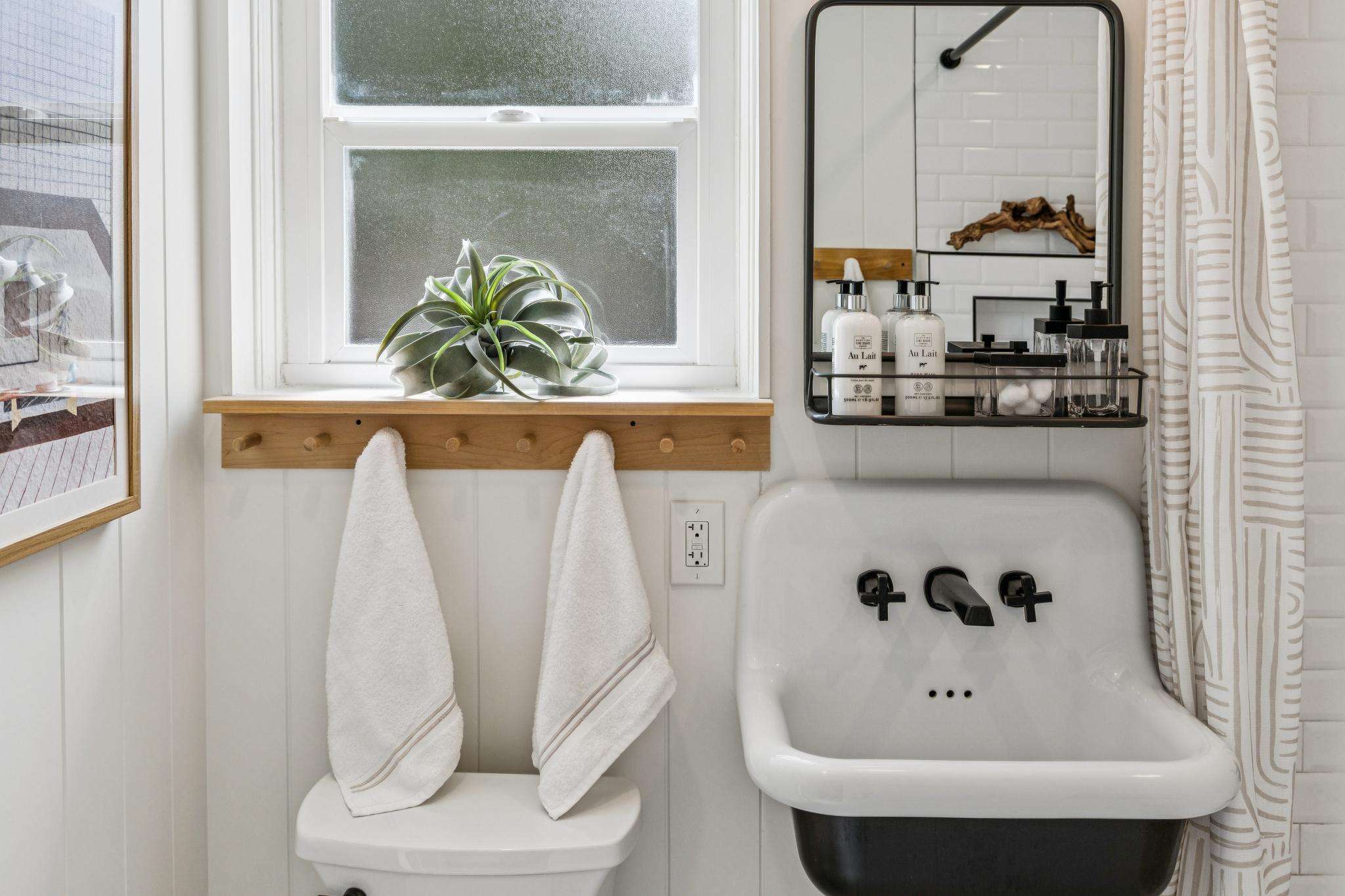 - Hall bathroom has shiplap wall detail, wall-mounted earthenware farmhouse sink, swing arm sconce and classic tile. A deep soaking tub combines with both overhead and hand showers. Hooks and nooks organize daily rituals