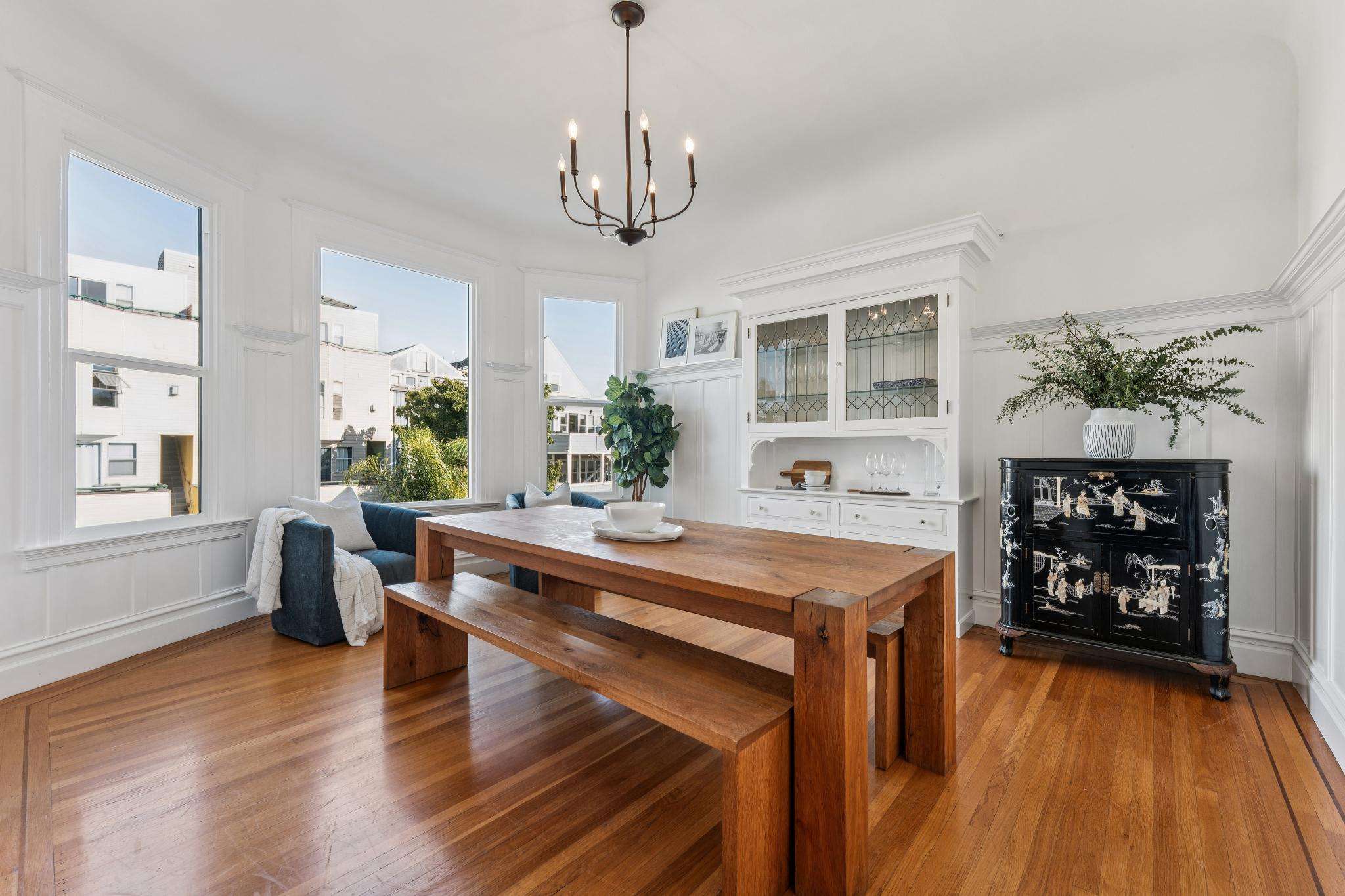 A sophisticated top-floor Edwardian residence where timeless architecture meets refined modern living. Soaring ceilings, rich hardwood floors, and beautifully preserved period moldings and wainscotting create an atmosphere of classic San Francisco elegance, while curated updates bring comfort and ease to daily life.