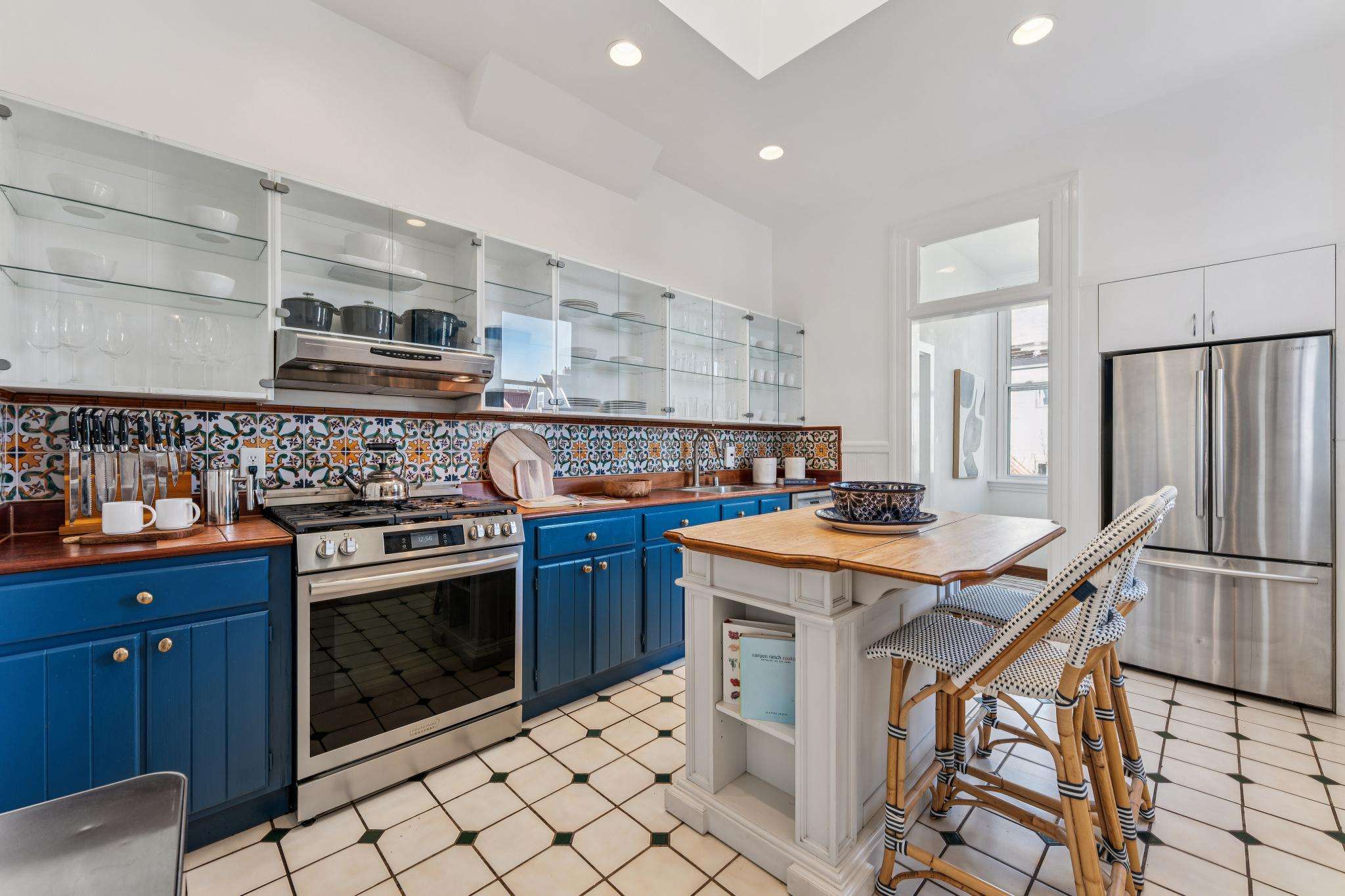 The gracious living room, anchored by a decorative fireplace, offers an inviting setting for intimate gatherings, while the spacious dining room, with original built-in cabinetry, allows for well-attended dinner parties. A generously sized office provides exceptional flexibility for working or relaxing at home. The thoughtfully updated eat-in kitchen is flooded in natural light by an expansive skylight. An extraordinary sun-filled garden stretches across the full width of the extra-wide property, offering a rare and peaceful outdoor sanctuary in the heart of the city.