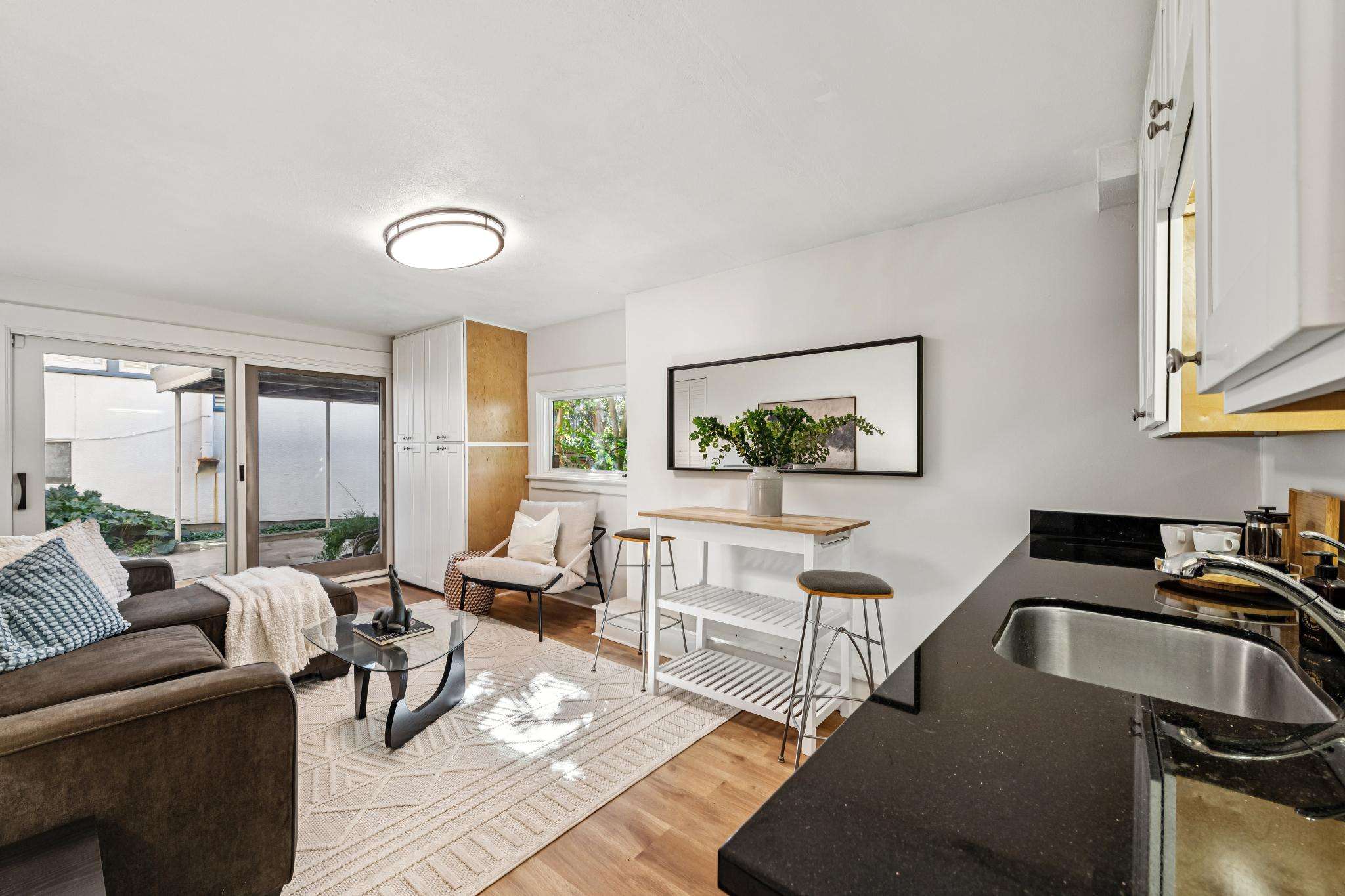 THE GARDEN UNIT The separate lower level offers remarkable flexibility with two garden rooms and a full tiled bath with shower —ideal for a home office, guest suite, creative space, or potential in-law setup. A slider door allows for entry on the driveway side, and a door opens to the garden at the other end. These spaces can be closed off or combined as owners desire.